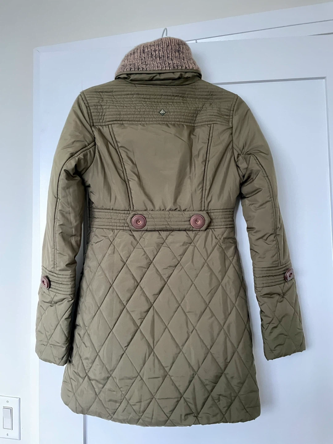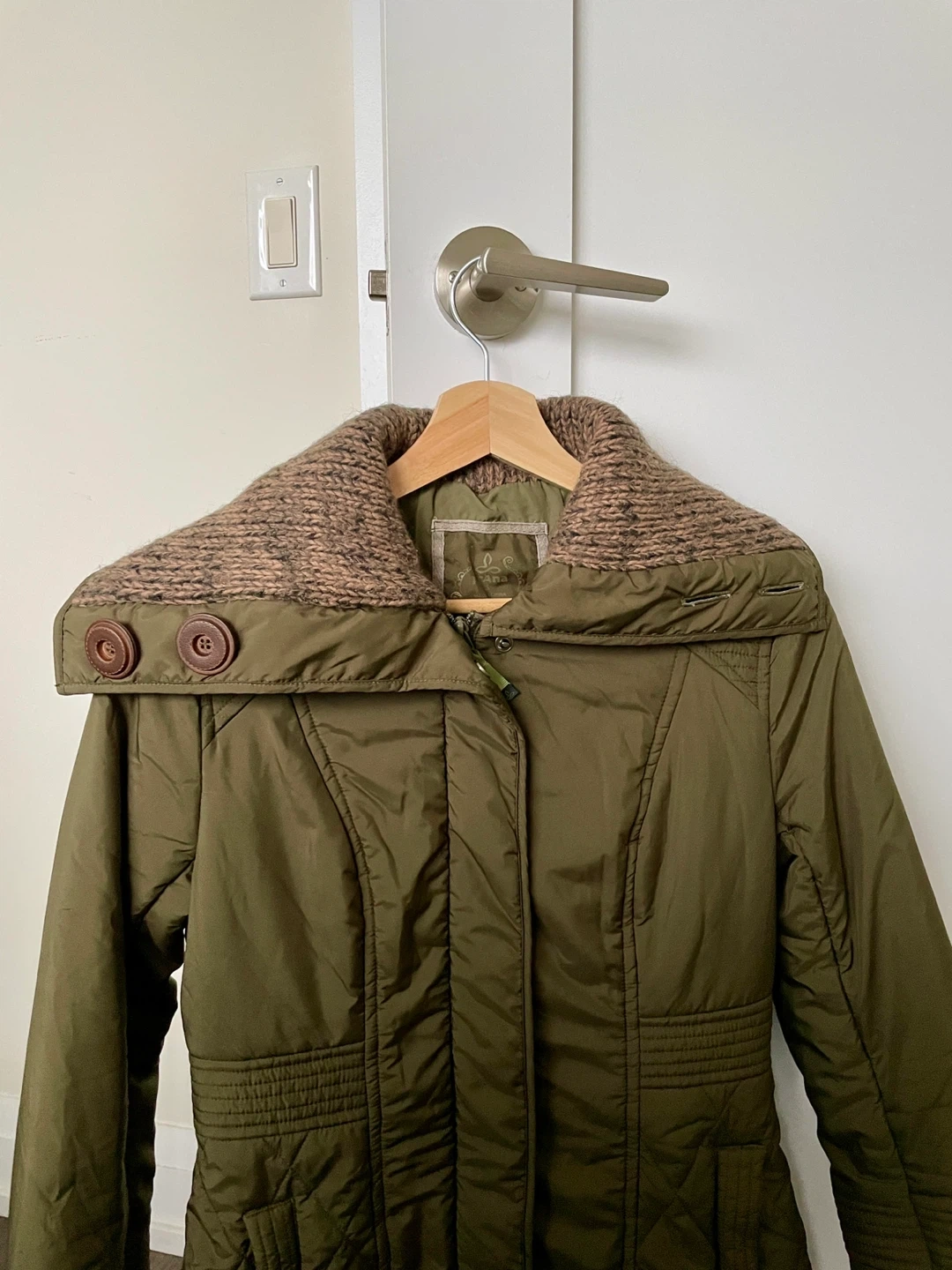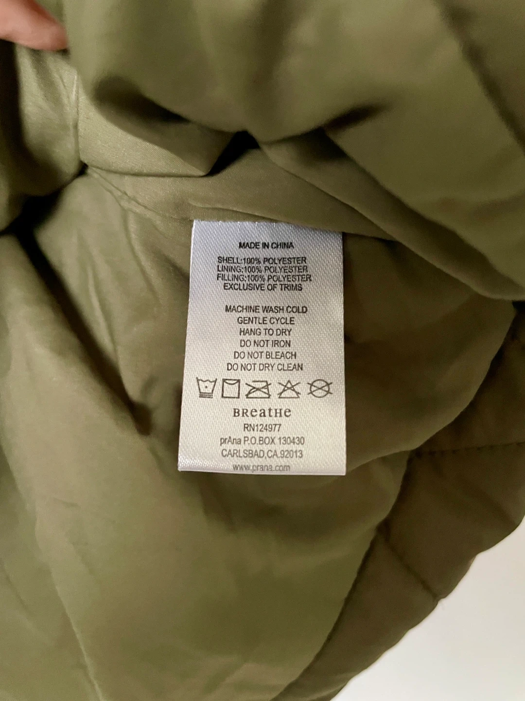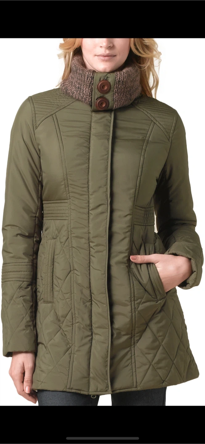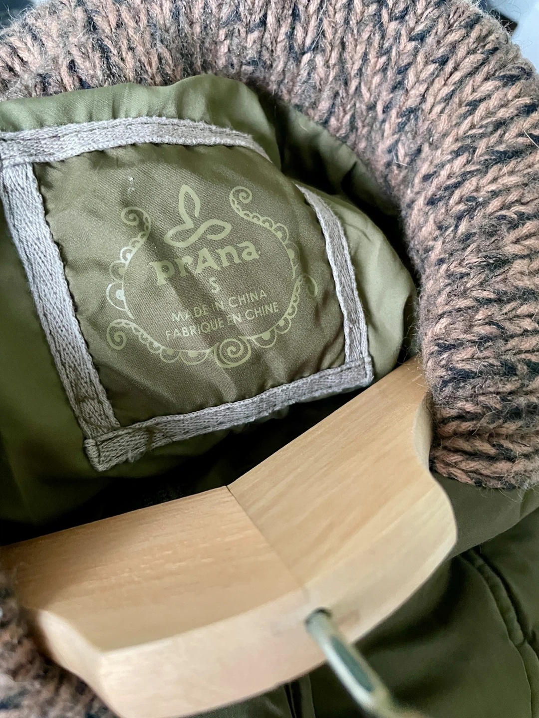 Selling a very gently used Prana Breathe jacket in size small. It's an olive green quilted design with a cozy knit collar - can be styled in two ways. The shell and lining are 100% polyester. It's in great shape and ready for a new home!