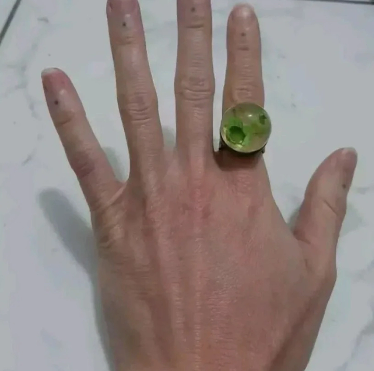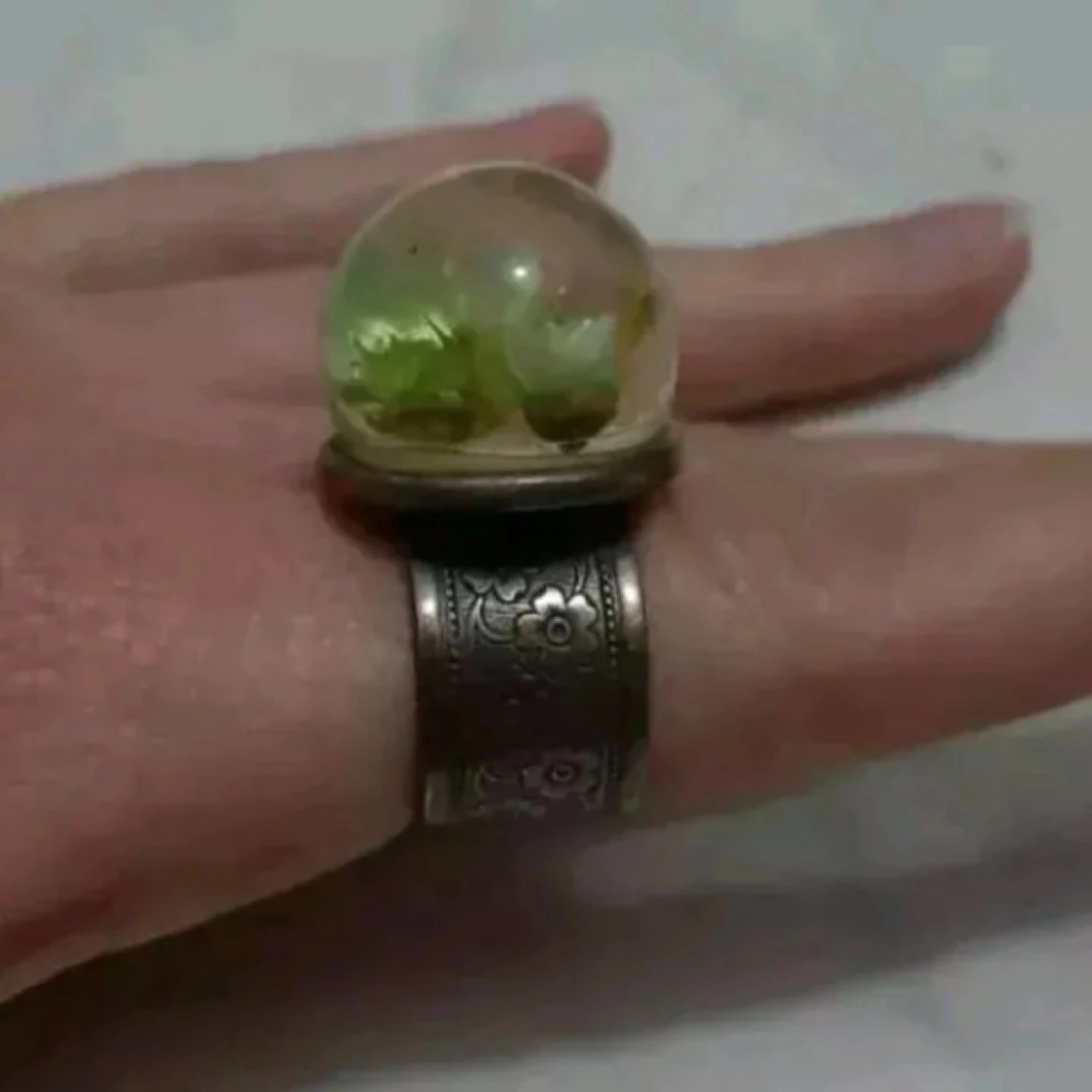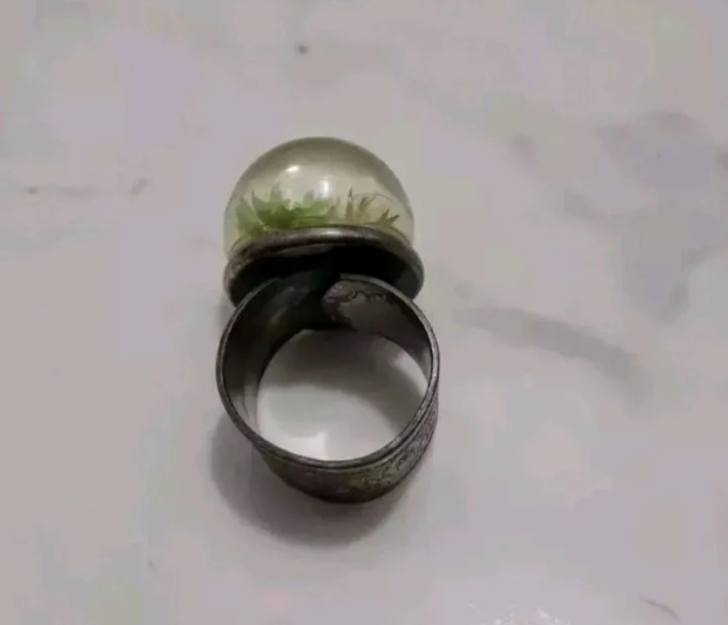 Incredible sterling silver ring with glass dome containing flowers! Vintage from the 80s, the band is beautifully ornate and fully adjustable. This piece is amazing and gets a ton of attention!