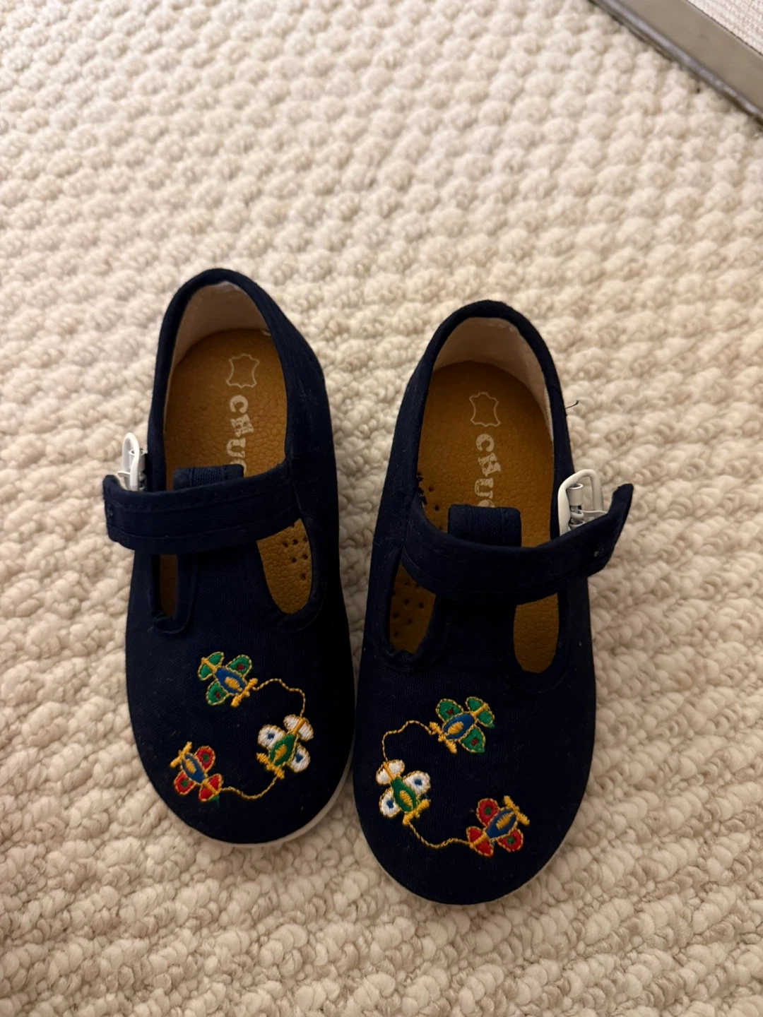 These adorable Cienta Mary Jane shoes are perfect for your little one! They're a lovely navy blue colour and feature cute embroidered detailing. They are in great condition and ready for a new home. Size 25, which is approximately a US size 9