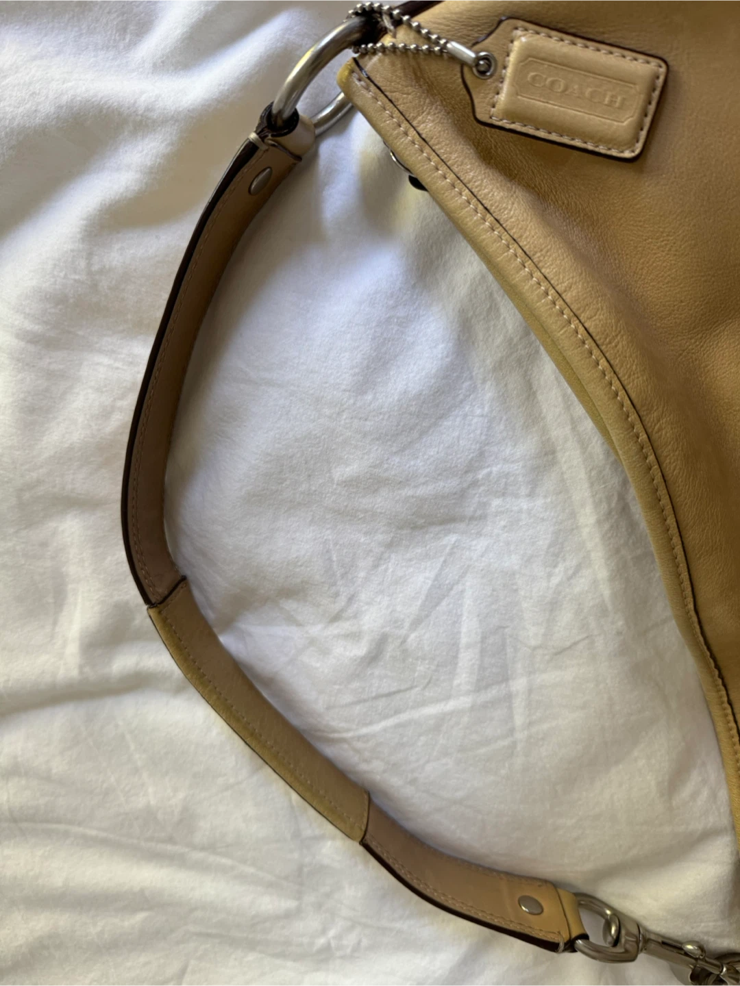 Selling a Coach leather bag. It's a beautiful beige colour. There are some signs of wear, as shown in the photos, but it's still in great condition. The bag is crafted from glove-tanned cowhide.