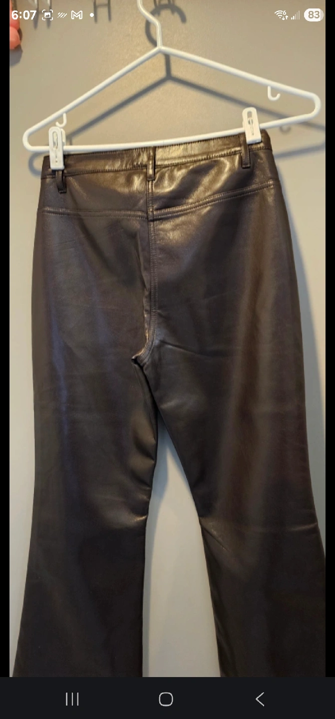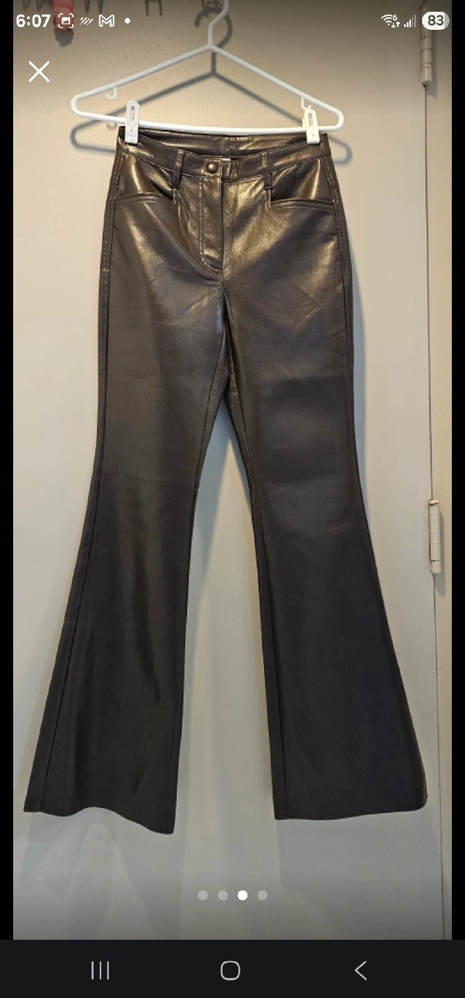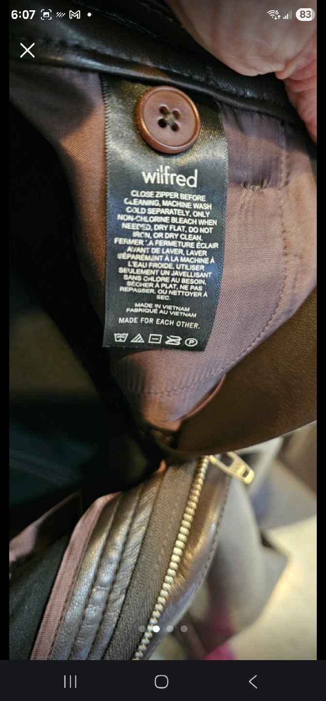 These Wilfred Free pants are made of vegan leather! They have a zipper and button closure. The care instructions are to close zipper before washing and machine wash cold separately, only non-chlorine bleach when needed, dry flat, do not iron, and do not dry clean