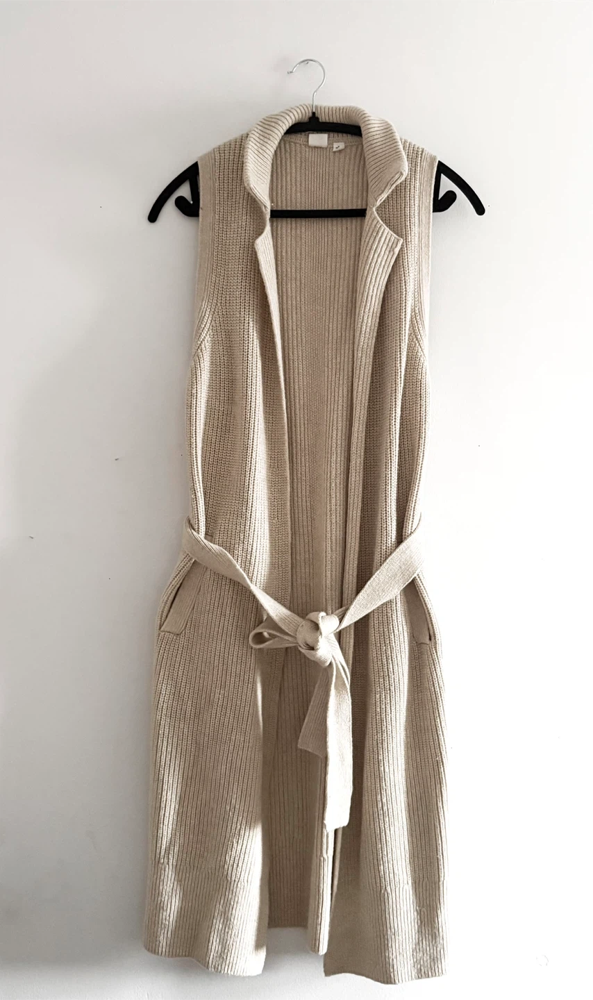 Cozy GAP vest in a neutral colour! It's a size M Petite and made of a soft merino wool blend 50% merino wool and 50% nylon Perfect for layering during the cooler months Runs below knee Two side pockets Hand wash only Bought online for my sister but didn’t fit New without original tag Price is firm Cash payment only Pick up - close to Lansdowne ttc station