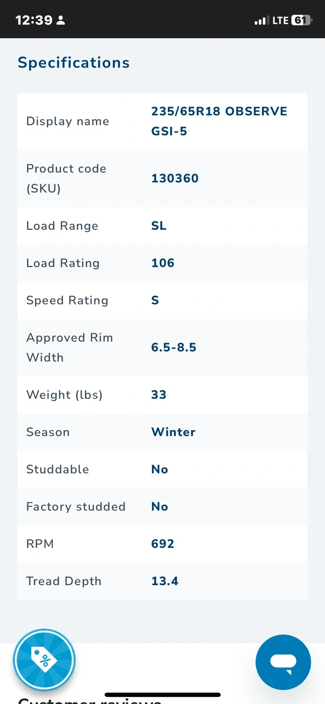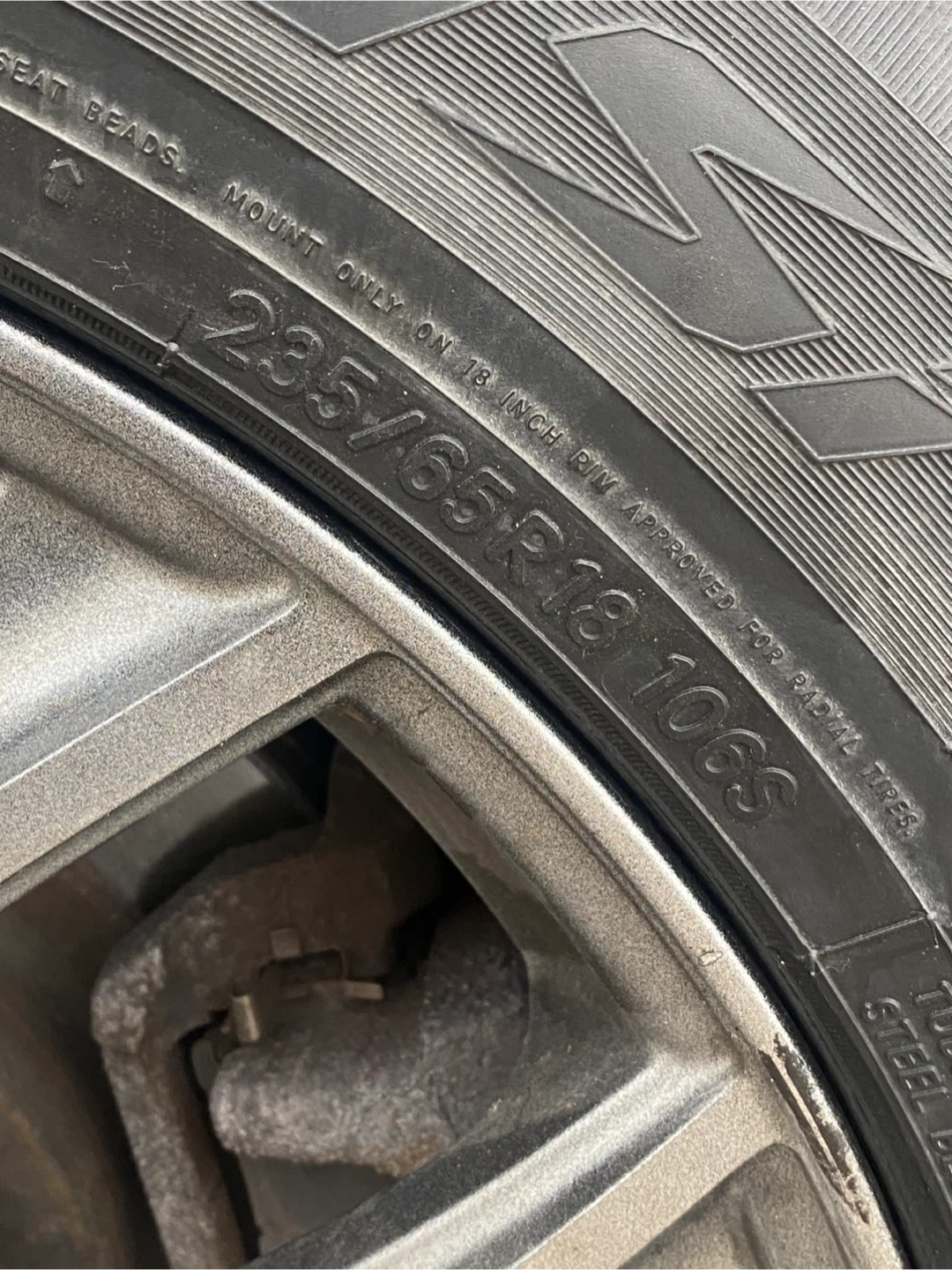 Selling a Toyo Observe GSi-5 winter tire, size 235/65R18. These tires are great for winter driving conditions. The tire has a load range of SL, load rating of 106, and a speed rating of S. It's designed for rims with a width of 6.5-8.5 inches. The tire weighs 33 lbs and has a tread depth of 12.3. Also included is an Autel MX-Sensor.