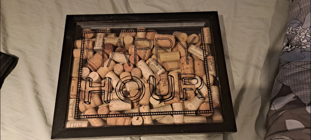 Wine cork shadow box with 'Happy Hour' lettering! It's in great shape and ready to add a touch of fun to your space To hang on the wall.