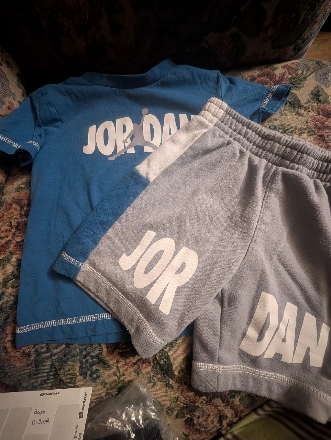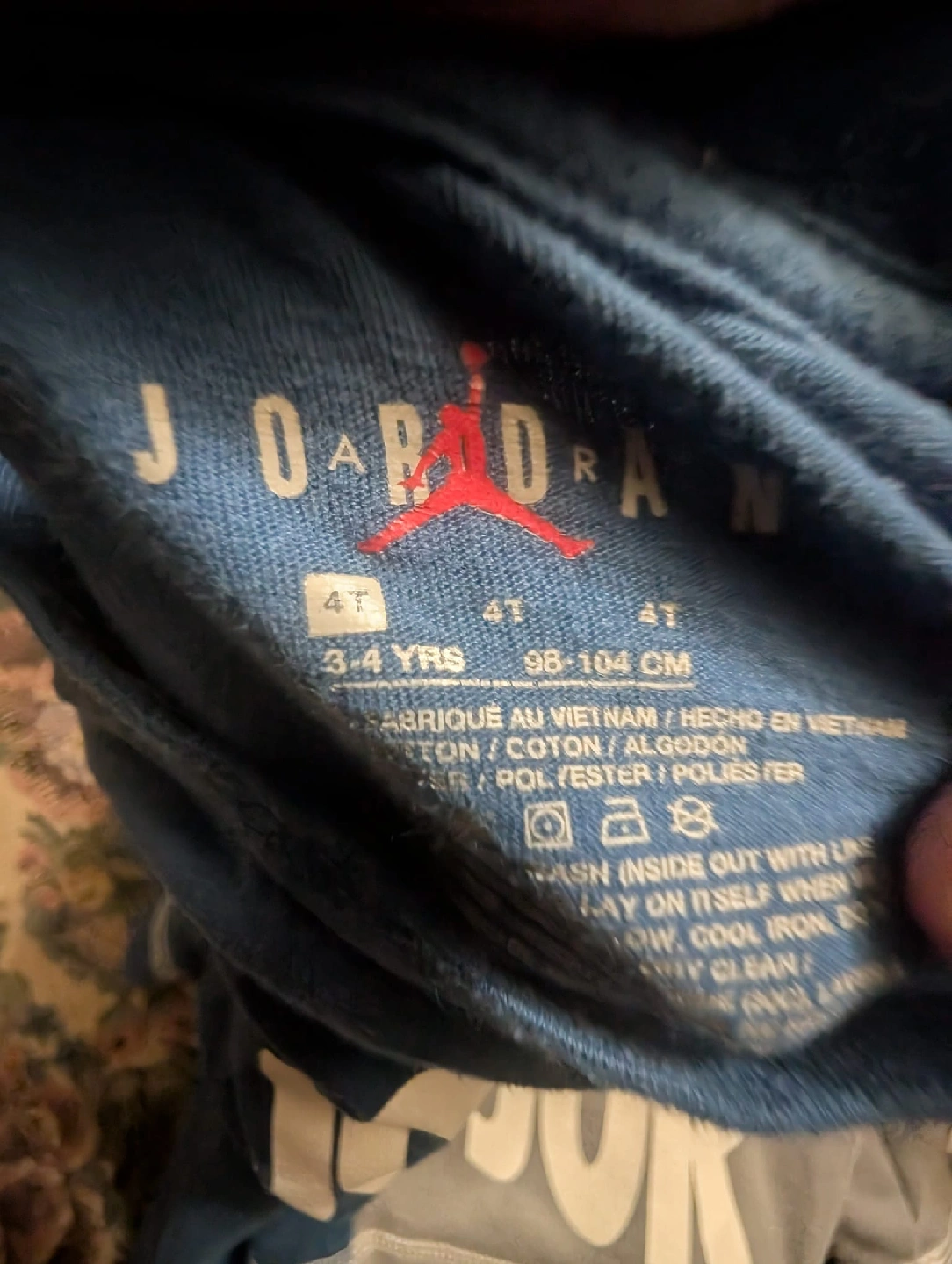 A cute Jordan set for your little one! This includes a blue Jordan t-shirt and grey Jordan shorts. The size is 4, suitable for kids aged 3-4 years (98-104 cm). Great for everyday wear!
