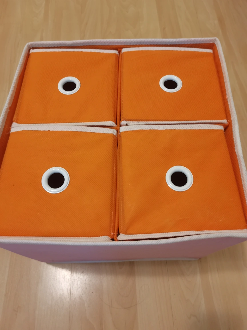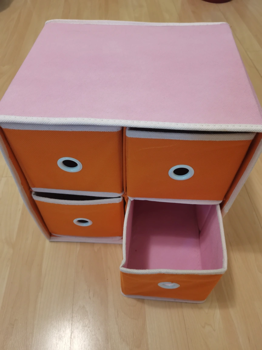 Here's a cute storage drawer unit, perfect for a kid's room or craft space! It features four orange drawers with white accents and a pink frame. It's in great shape and ready to help organize your space