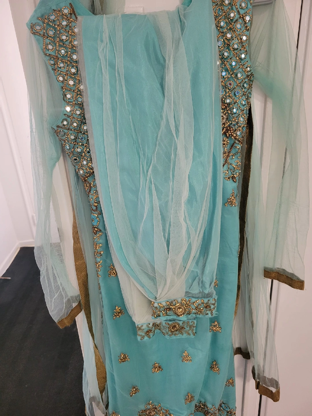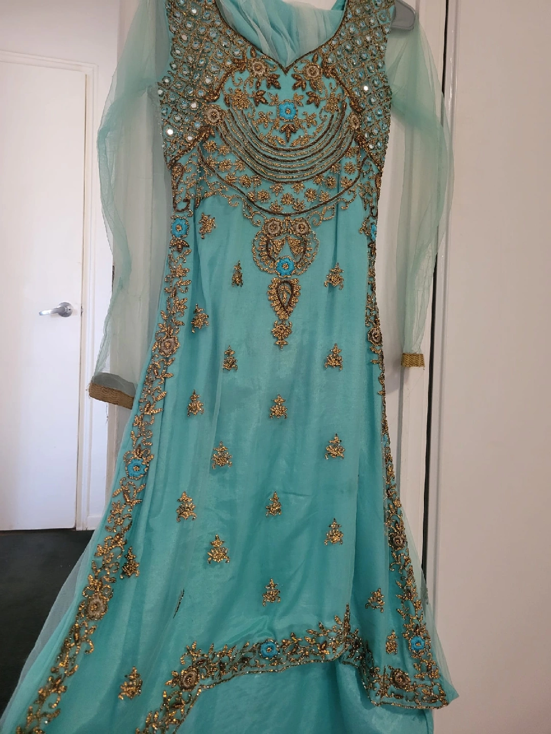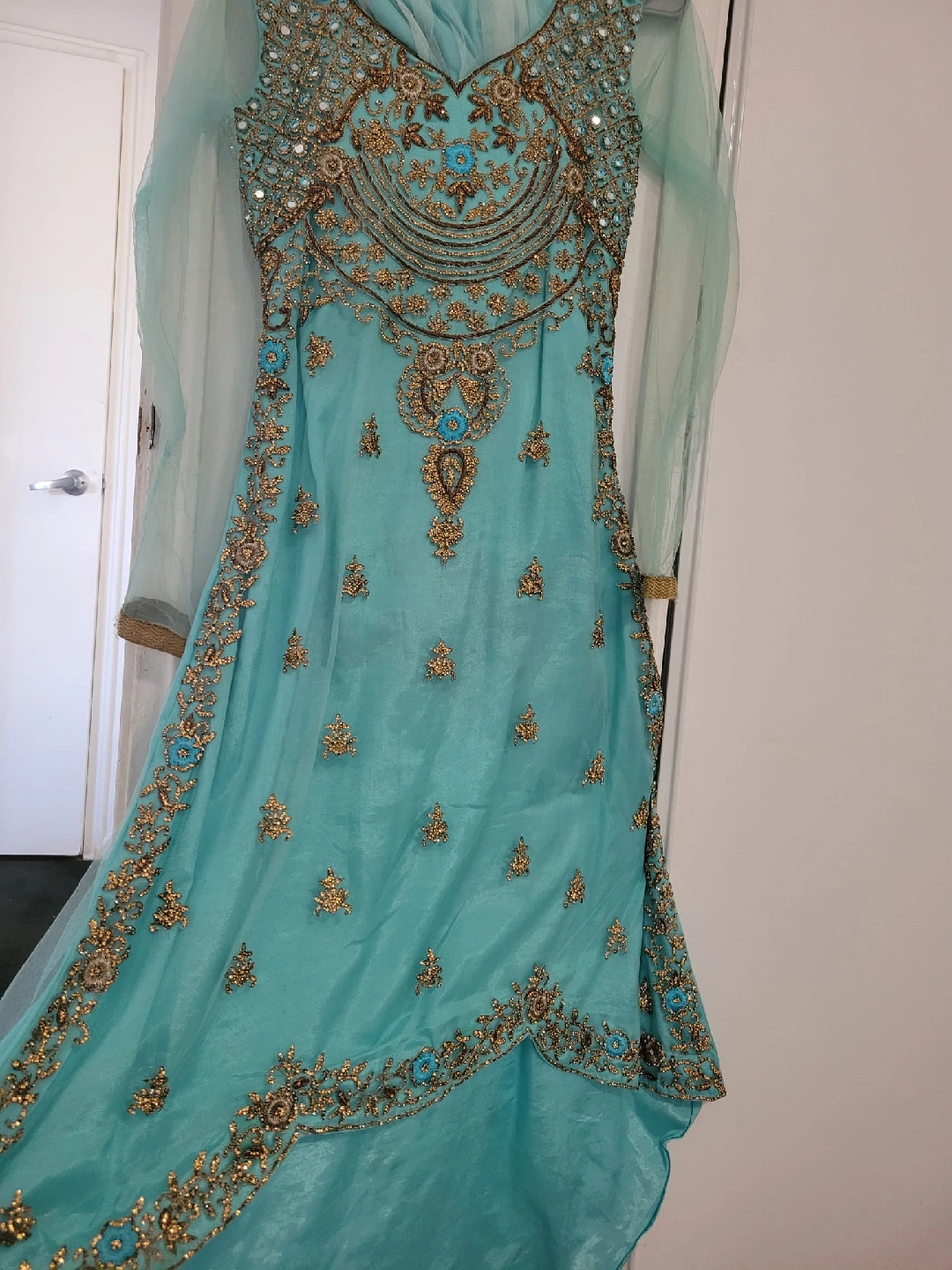 Beautiful high low anarkali dress with intricate gold embroidery. Perfect for a special occasion! It comes with a matching sheer dupatta. The dress features long sleeves and detailed embellishments. It's in great condition and ready for a new home