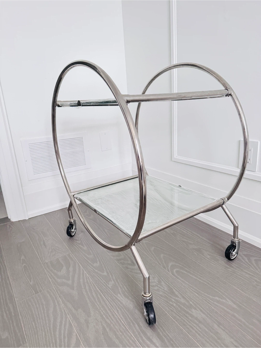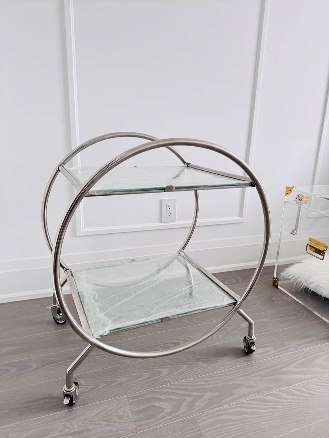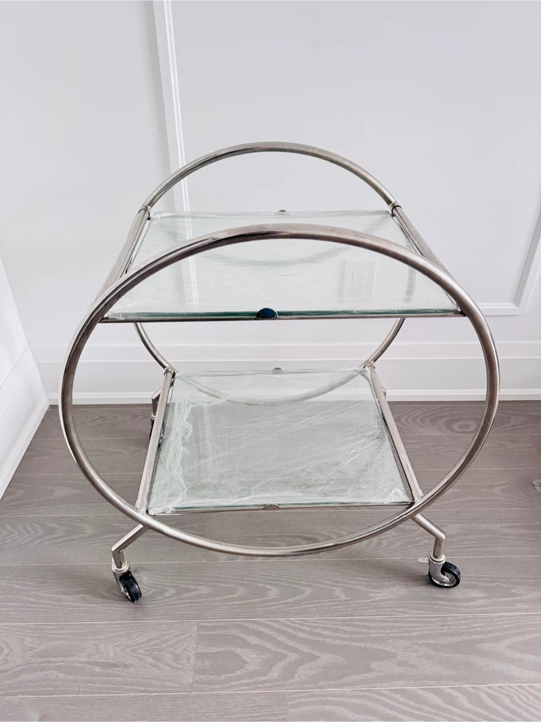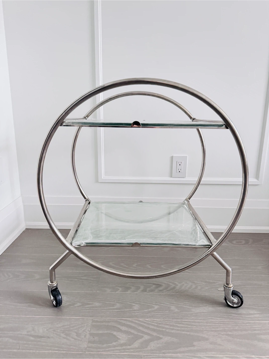 Selling a stylish round bar cart! It features a sleek metal frame and two clear glass shelves. Perfect for adding a touch of modern elegance to your home.