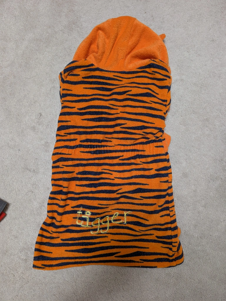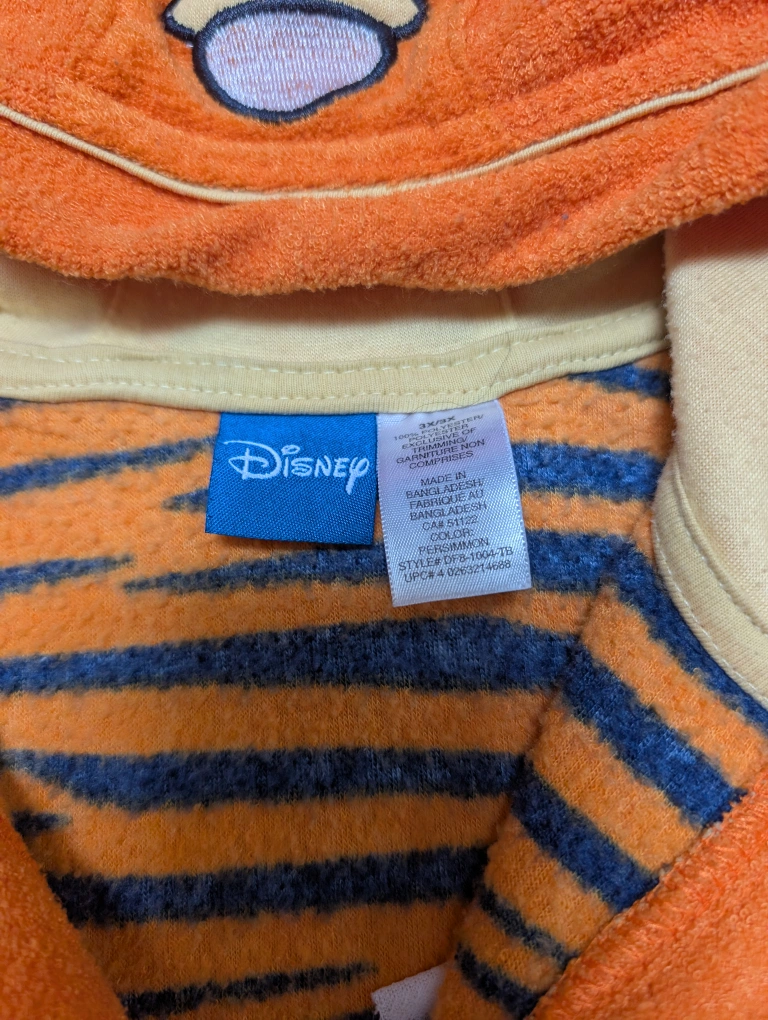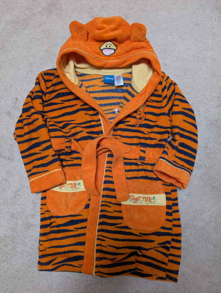 This adorable Disney Tigger robe is perfect for your little one! It's a size 3/4 and features a fun Tigger design. Made of 100% polyester, it's soft and cozy for after bath time or just lounging around. The robe is in great condition and ready for a new home! Porch Pick up Ajax Church and Delaney Please see My profile for more items
