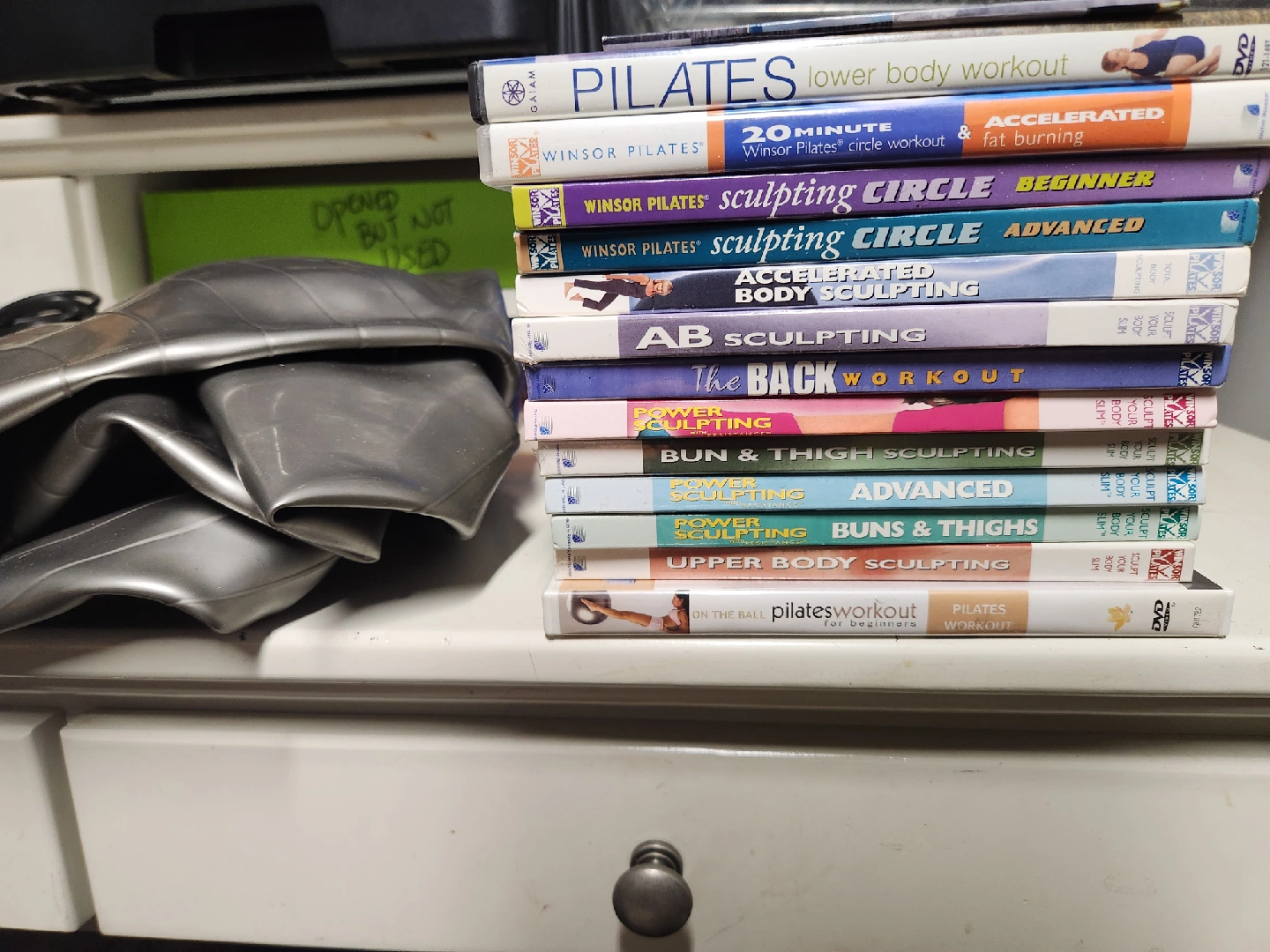 Selling a collection of Winsor Pilates DVDs, including titles like Lower Body Workout, Sculpting Circle (Beginner & Advanced), Accelerated Body Sculpting, AB Sculpting, The Back Workout, Bun & Thigh Sculpting, Upper Body Sculpting, and On the Ball Pilates Workout for beginners. Some of the DVDs have been opened but are unused!