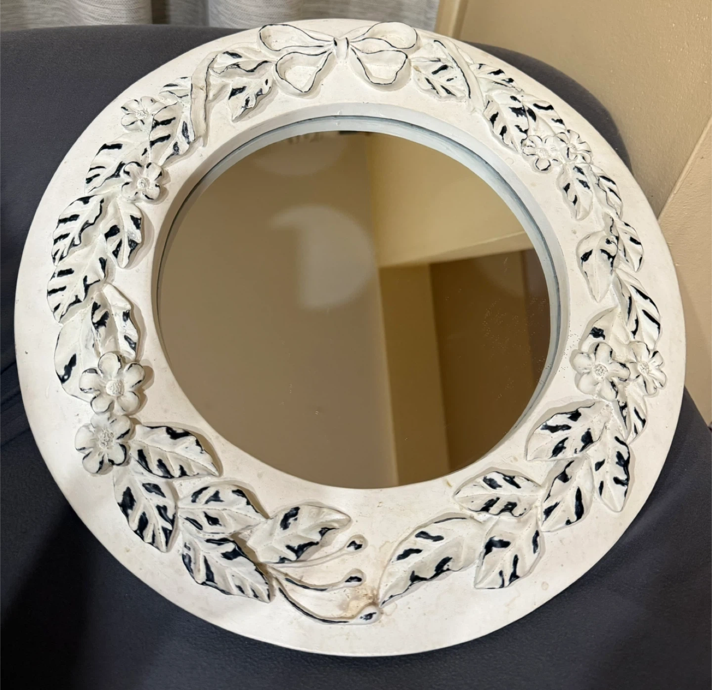 MOVING ALL MUST GO!!! Selling a charming round decorative mirror. It features a lovely floral and bow design around the frame, adding a touch of elegance to any room. It’s ceramic! Perfect for adding a bit of brightness and style to your home decor.