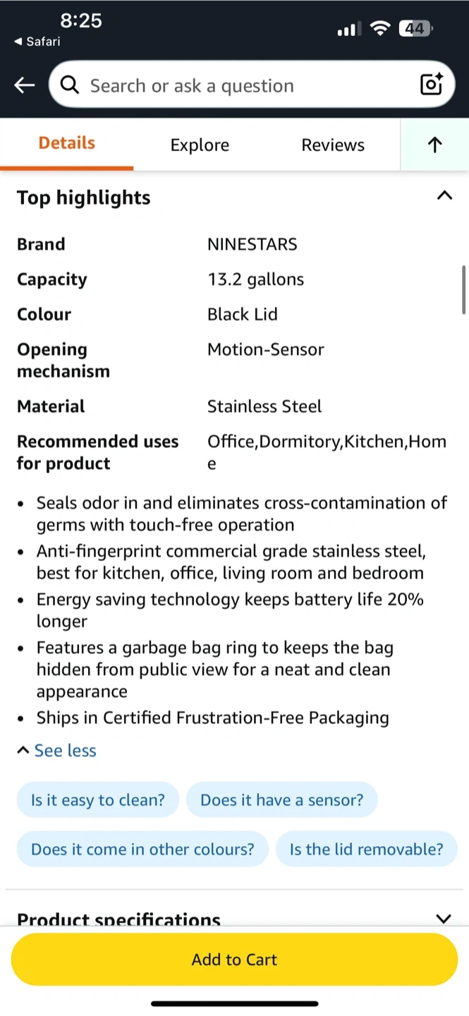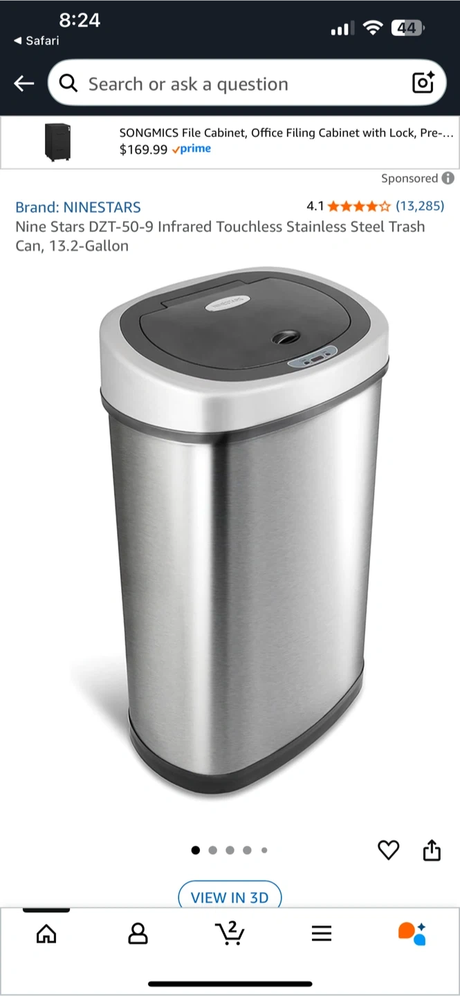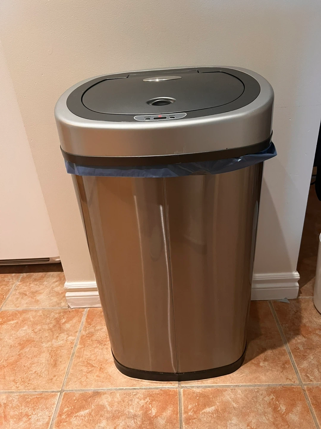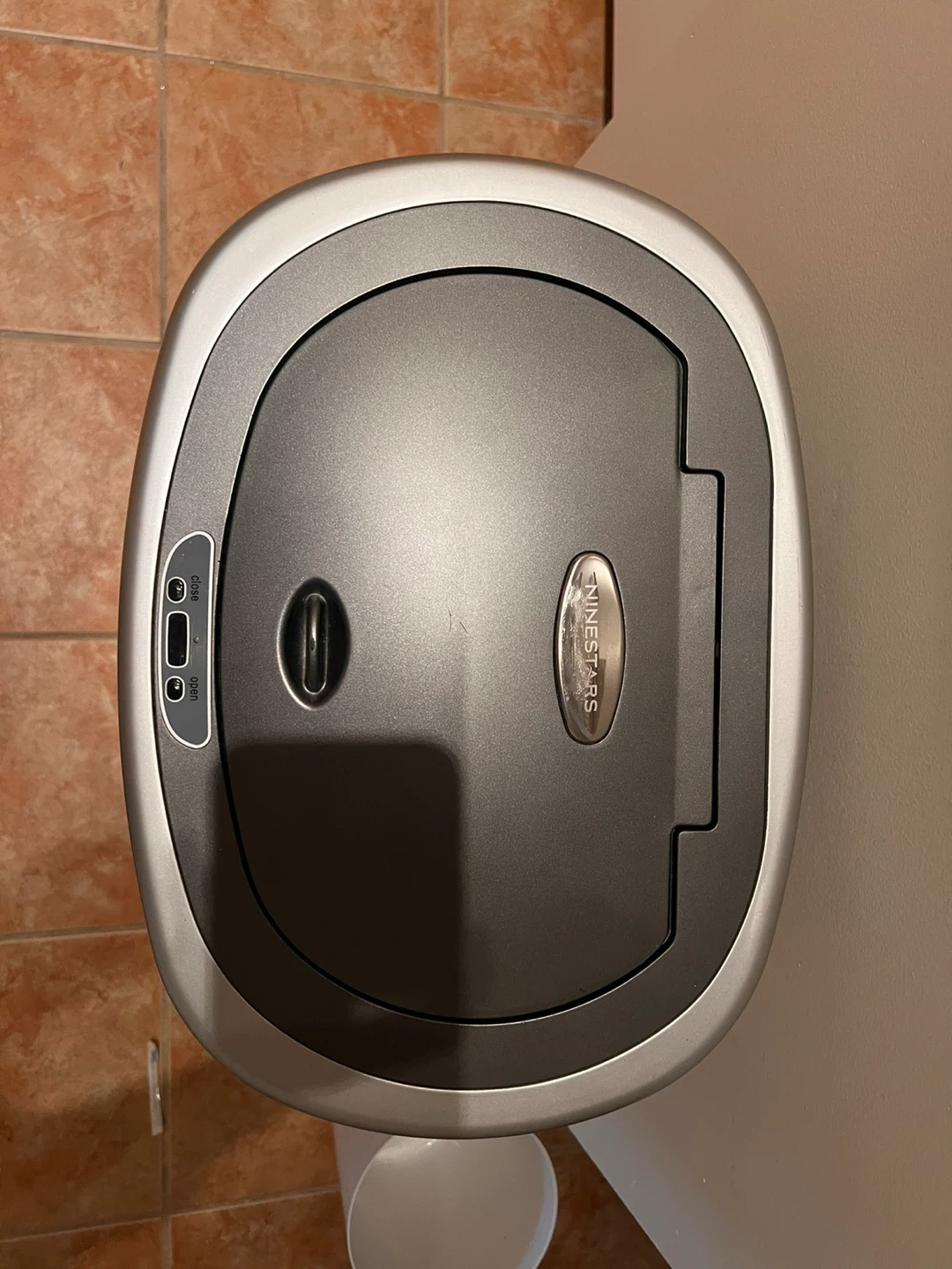 680Selling a Nine Stars touchless stainless steel trash can. It has a 13.2-gallon capacity and a black lid. The opening mechanism is motion-sensor activated. It’s perfect for the kitchen, office, living room, or bedroom. Seals odour and eliminates cross-contamination of germs with touch-free operation. The material is anti-fingerprint commercial grade stainless steel. Energy-saving technology keeps battery life 20% longer Please note 📝 ‼️: The battery area needs to be secured with tape. See pic for details! Extra batteries will come with it. It still functions perfectly!!! Cash only. Will be sanitized before pick up. Used at the kitchen 👩🏼🍳 Thanks