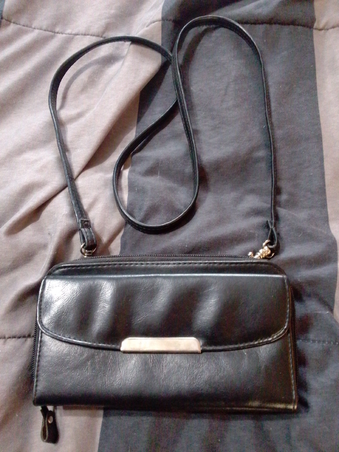 Selling a black leather wallet with a convenient strap. It's in used condition, as you can see from the photos, but still has lots of life left. Perfect for keeping your cards and cash organized!