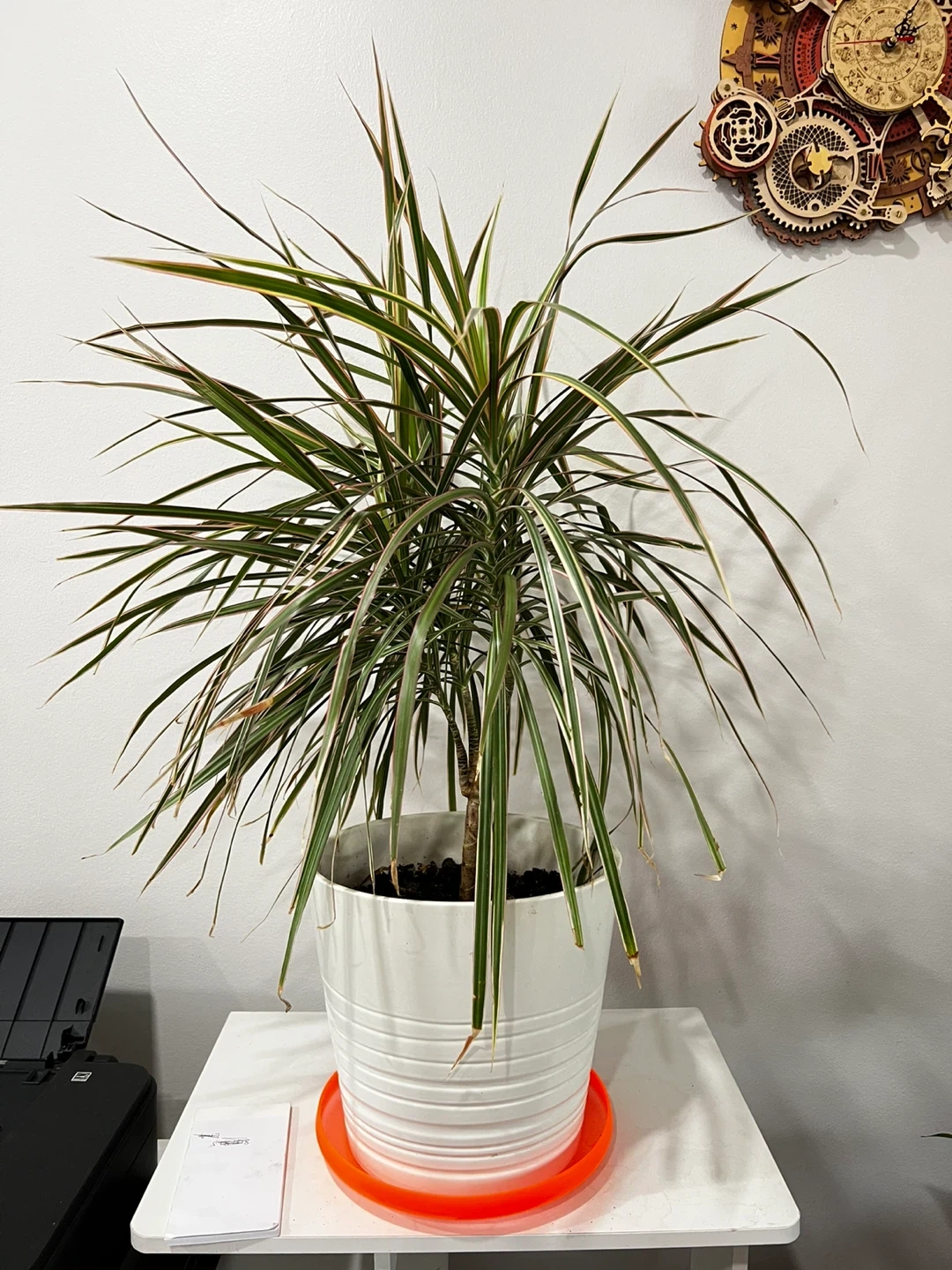 Selling a healthy Dracaena Marginata plant in a white pot! This plant is perfect for adding a touch of greenery to your home or office. It's easy to care for and thrives in bright, indirect light. The pot and orange saucer are included.