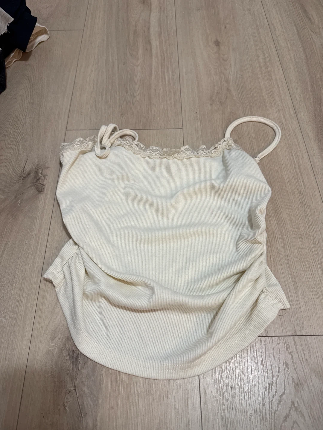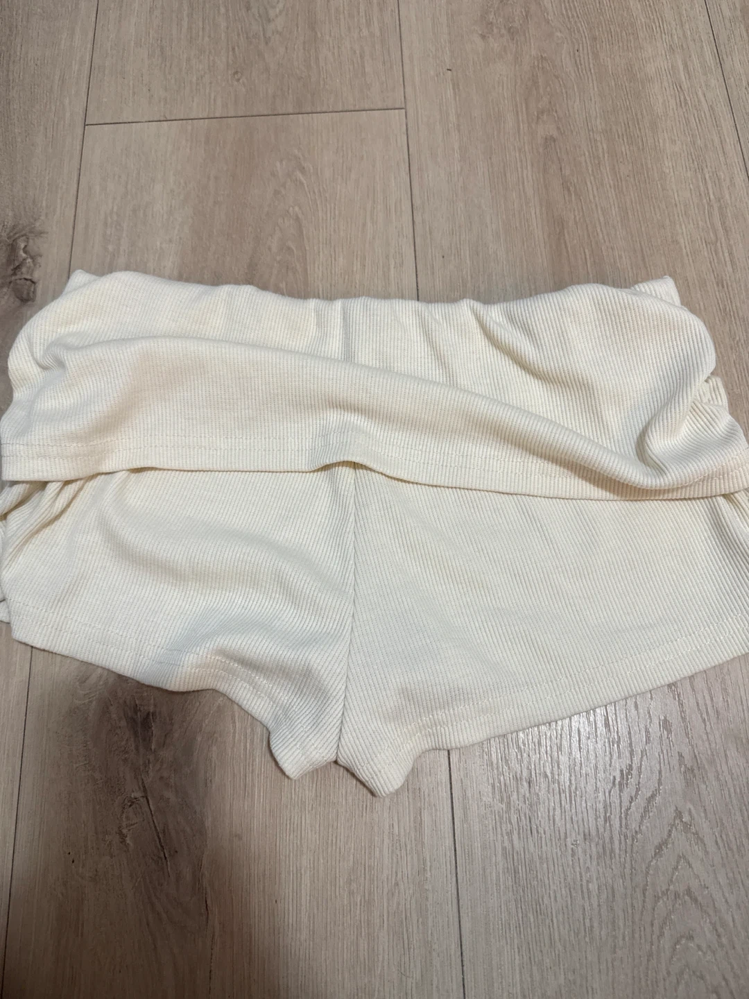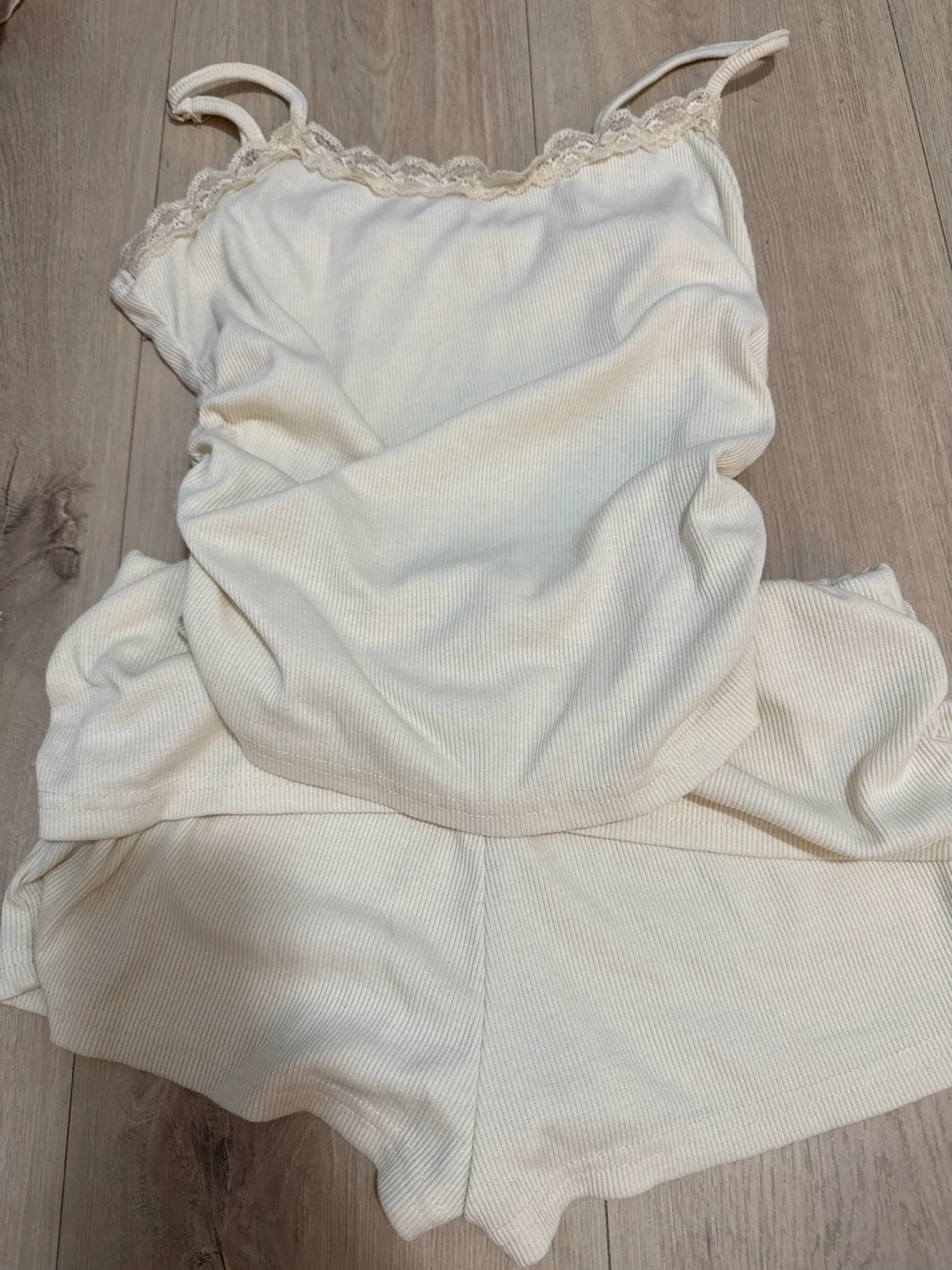 15Selling a cute white ribbed tank top and shorts set. It's in great condition and perfect for lounging or wearing out on a warm day. The top has delicate lace detailing, and the shorts have a comfortable, stretchy fit!