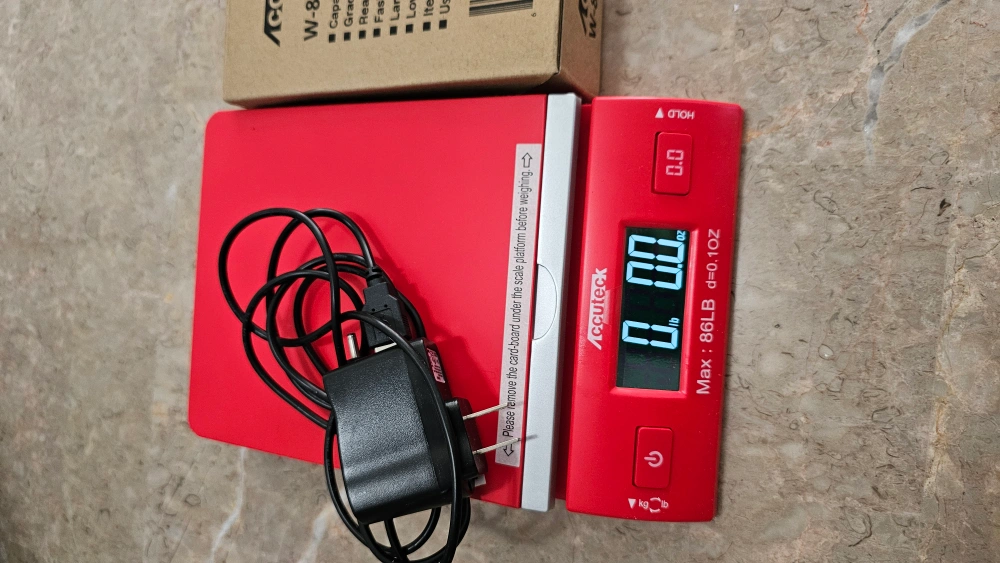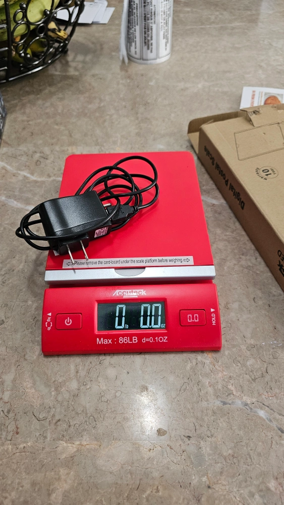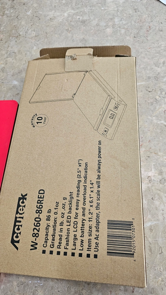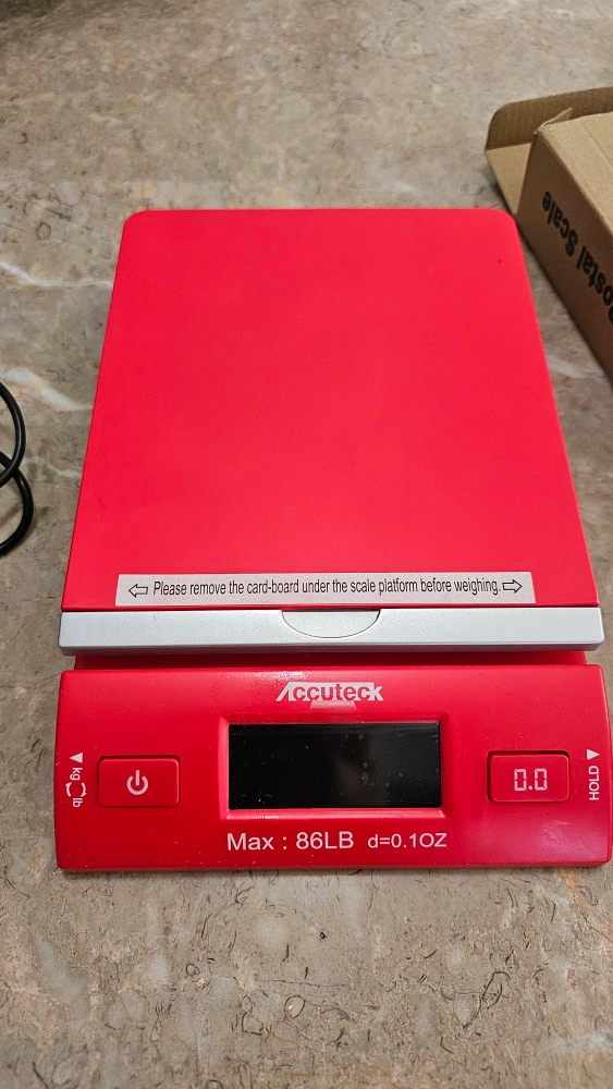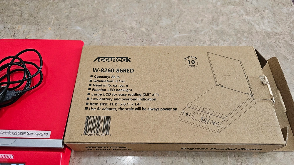 Selling a red Accuteck digital postal scale. It has a maximum capacity of 86 lb and a graduation of 0.1 oz. It reads in lb, oz, and g. The scale has a large LCD for easy reading and a fashion LED backlight. Included is the AC adapter, so the scale will always be powered on. It comes with the original box
