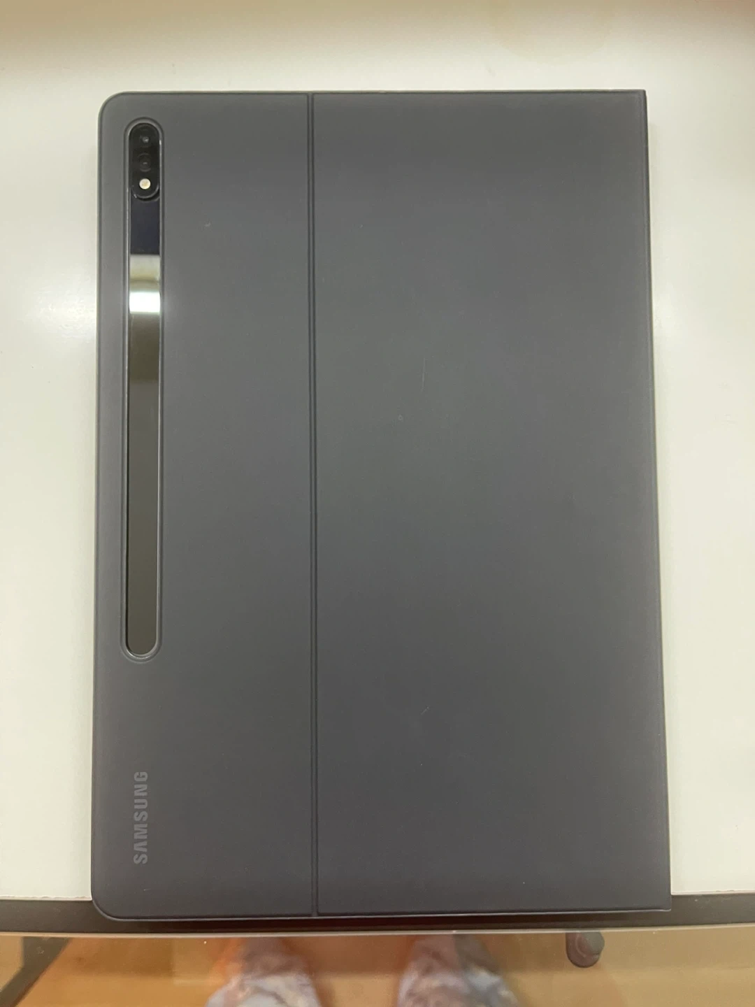 Selling a Samsung tablet with a grey cover. It's in great condition and like new. It just got refurbished.