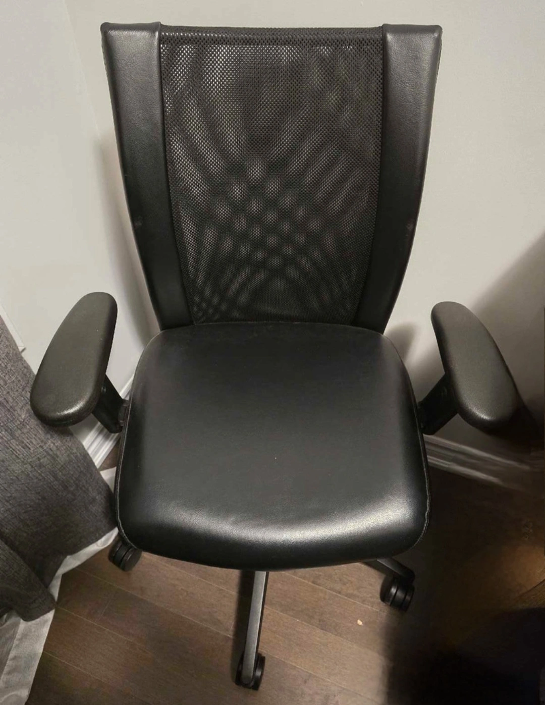 Selling a black office chair. It's in excellent condition and ready for a new home office setup! The chair features a mesh back for breathability and comfortable armrests. Perfect for long hours of work or study.