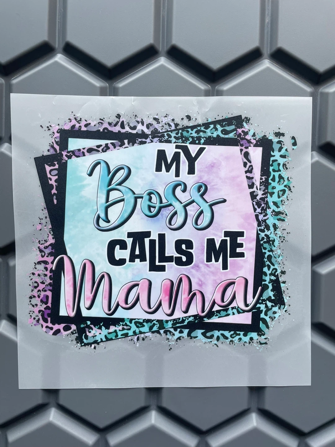 This decal features the phrase 'My Boss Calls Me Mama' in a colourful design. It measures approximately 10 x 10 inches , perfect for adding a personal touch to various items