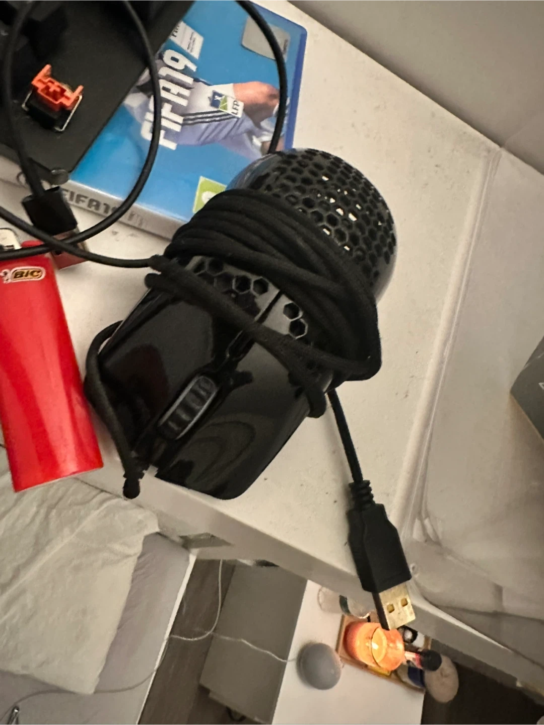 Selling a black gaming mouse. It's in good condition and ready for a new owner! It has a cool honeycomb design on top.
