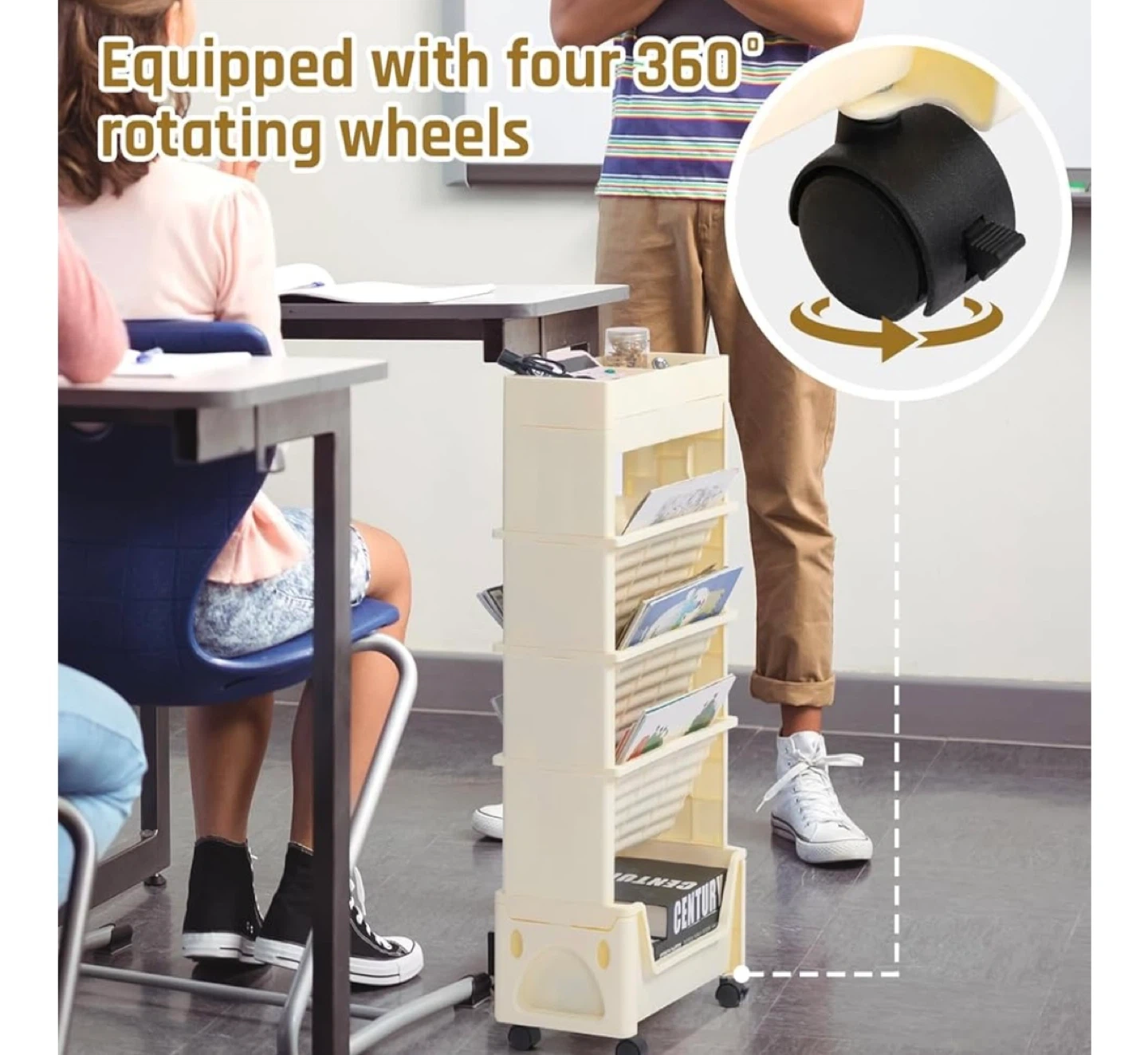 Looking to organize your space? This 5-tier rolling storage cart is perfect for storing books, documents, or even small items! It's beige in colour and features a top shelf with compartments and a drawer for added convenience. The cart is on wheels, making it easy to move around your home or office