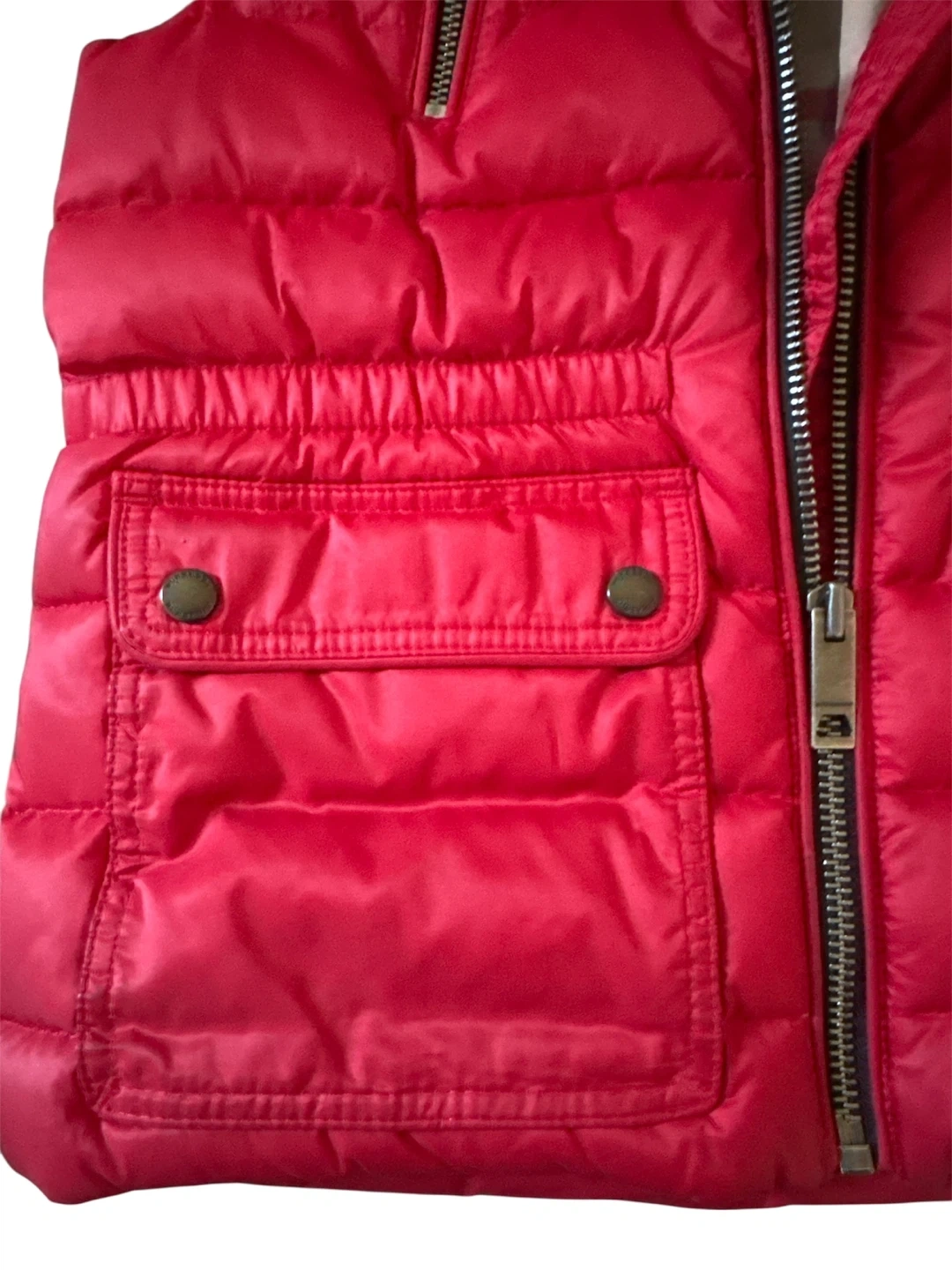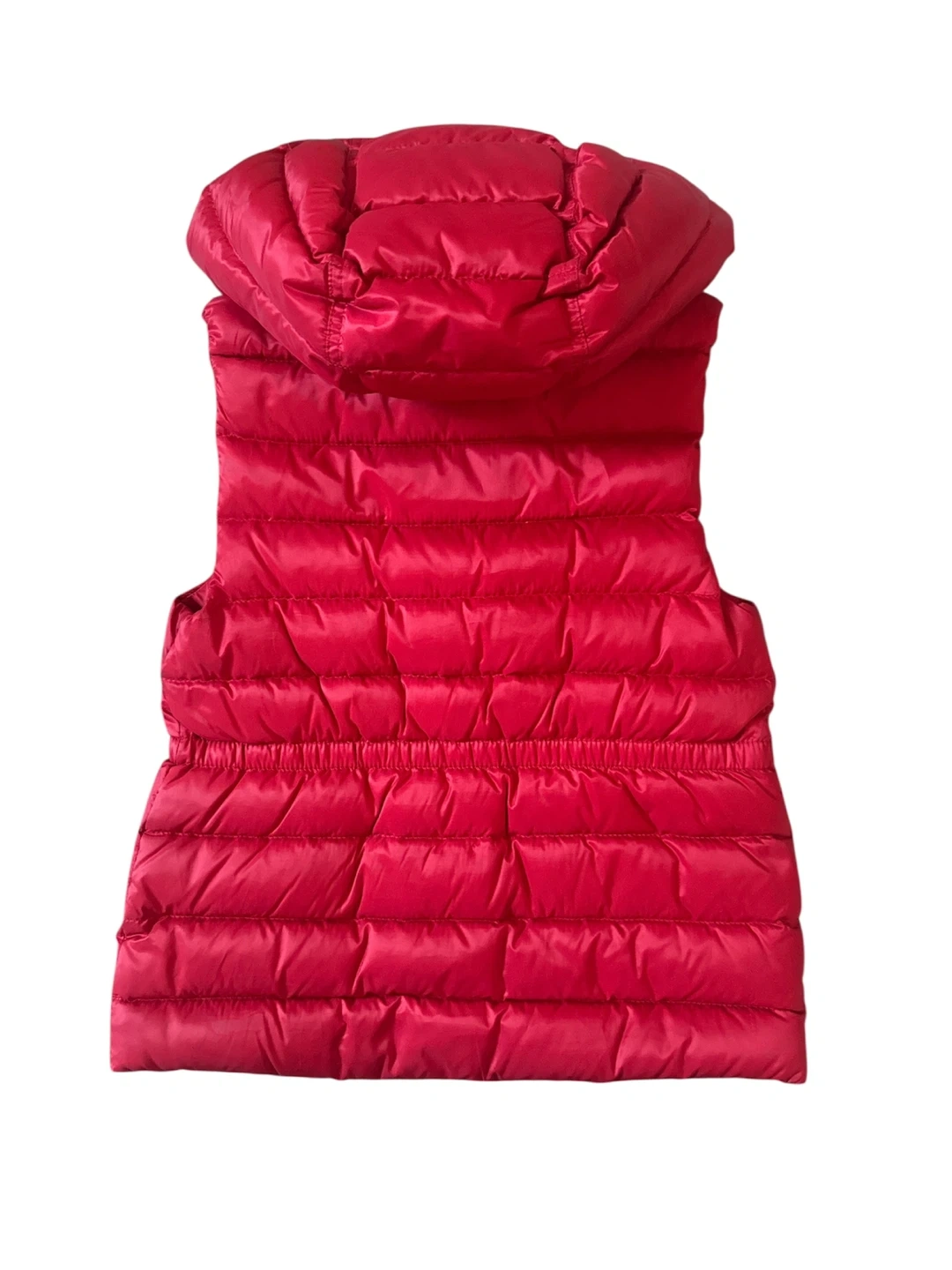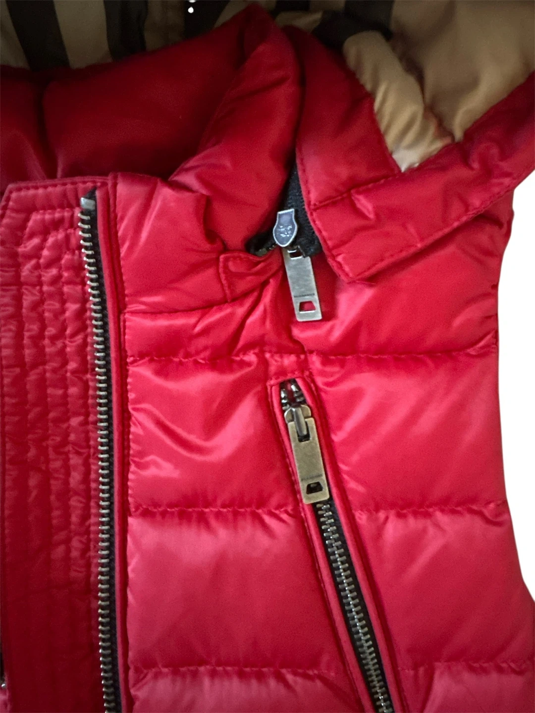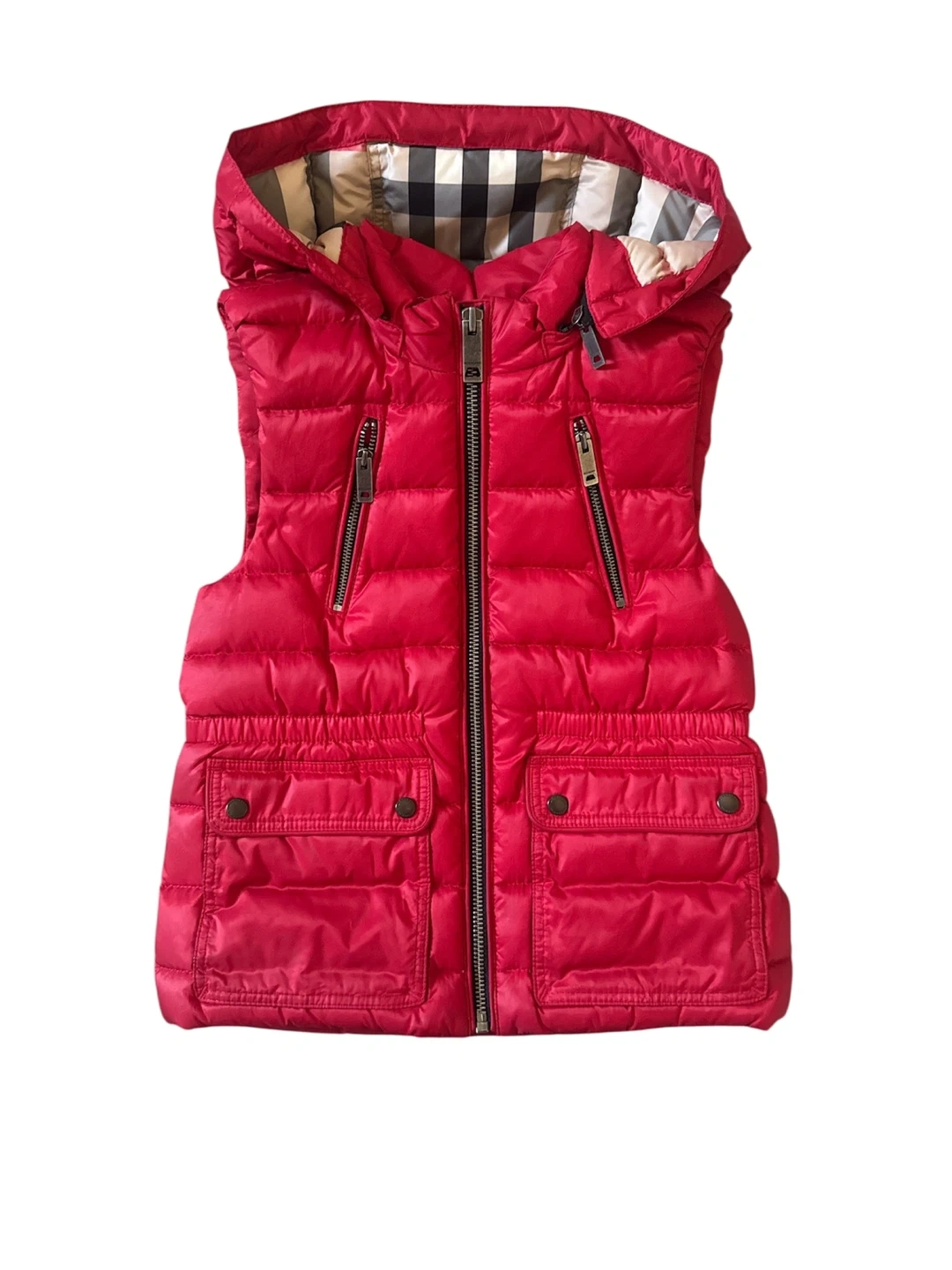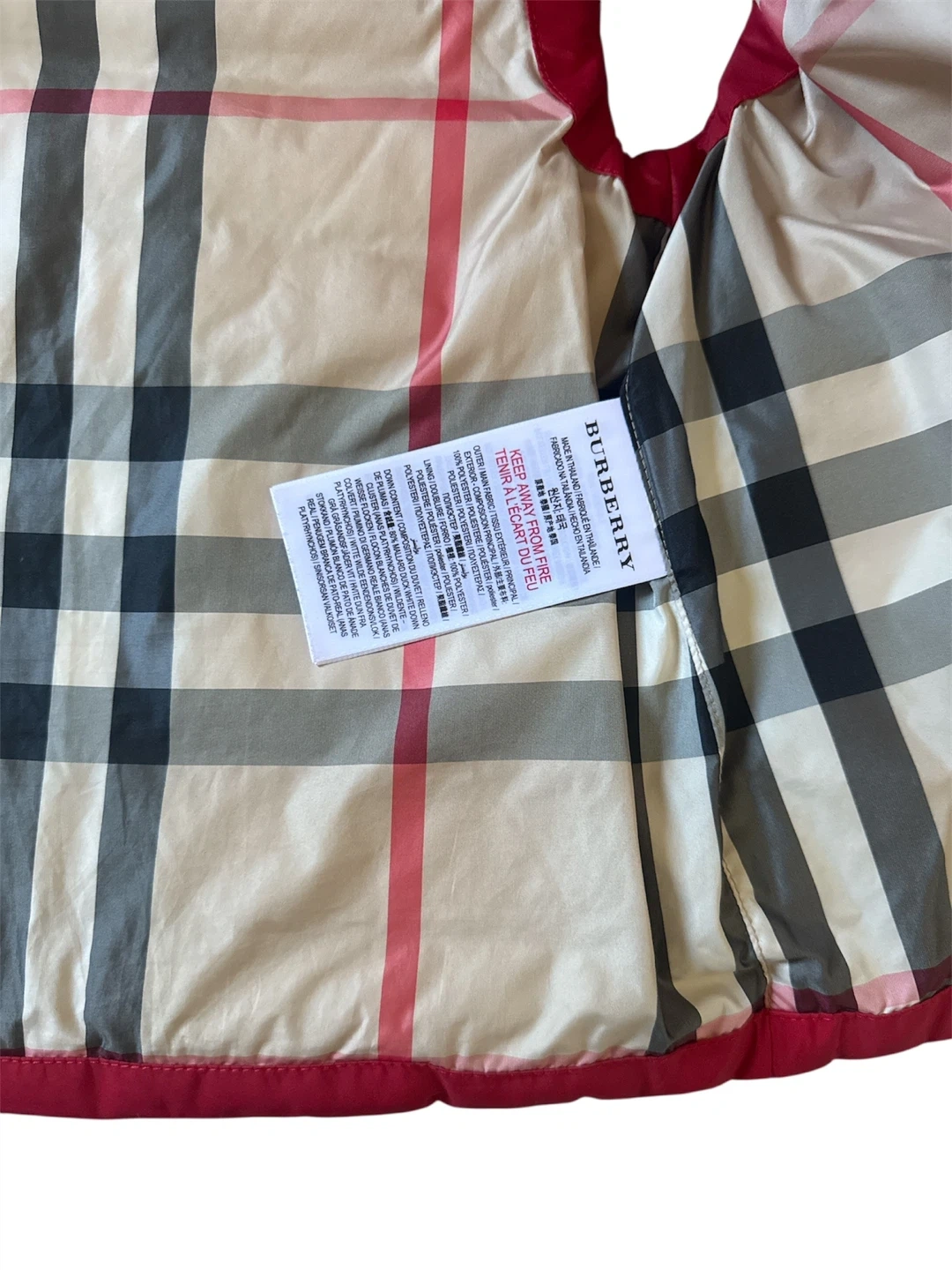 A stylish and warm Burberry children's puffer vest in a vibrant red colour. It features a hood and the classic Burberry check lining. Perfect for keeping your little one cozy!