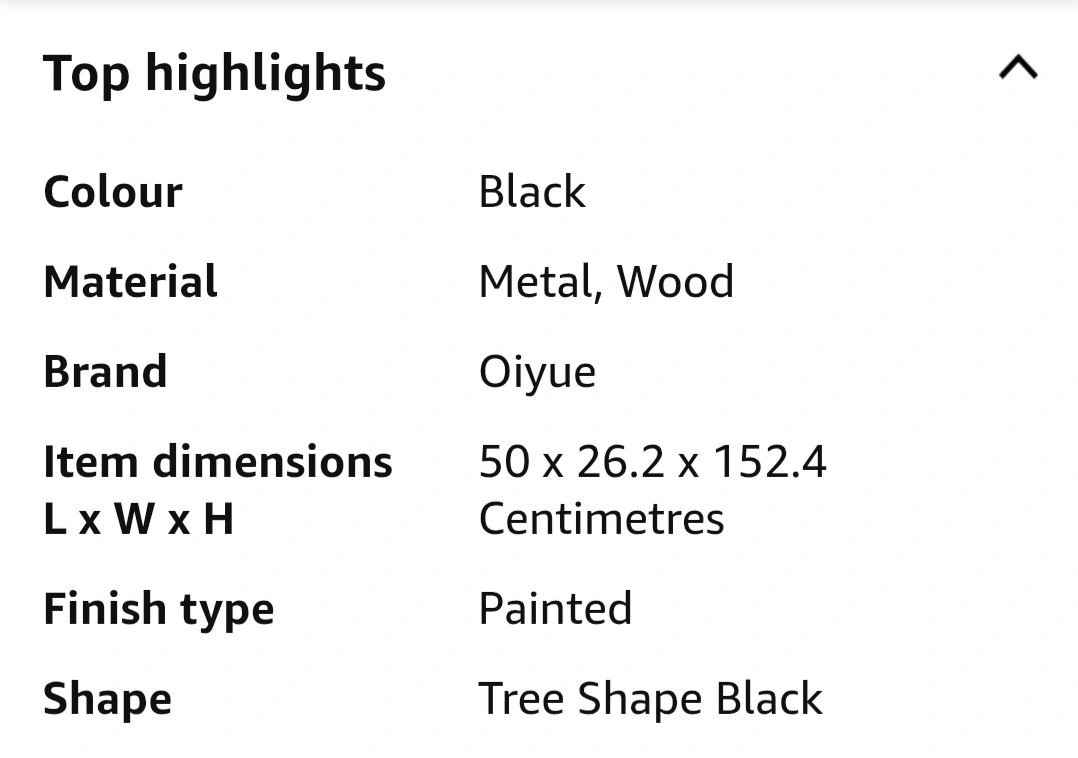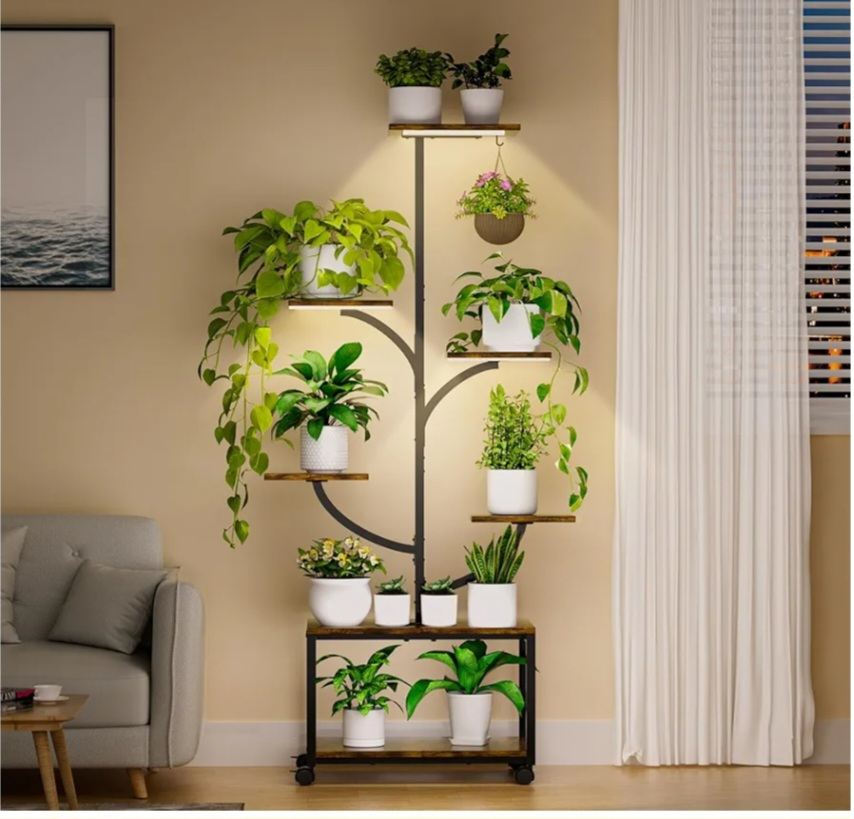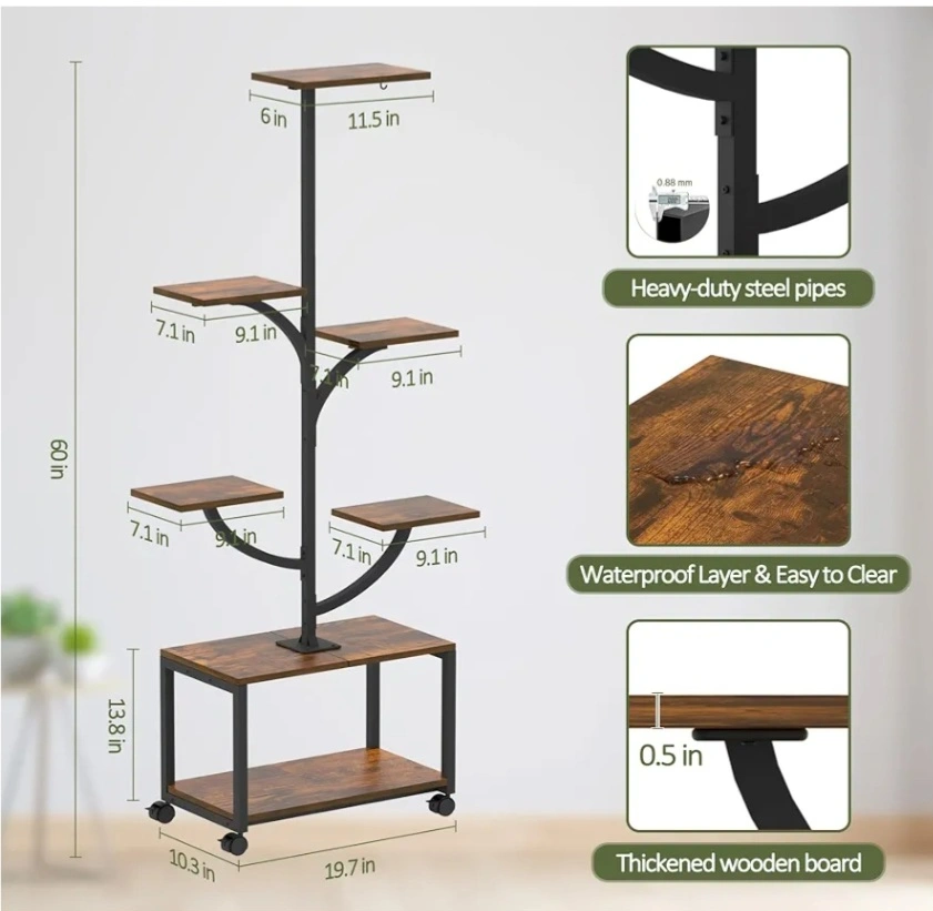 Selling a 60" tall Oiyue plant stand, perfect for indoor plants! It features a tree-shaped design with 7 tiers, made from metal and wood. The stand also has wheels for easy moving and grow lights to help your plants thrive. The colour is black and the dimensions are 50 x 26.2 x 152.4 centimetres