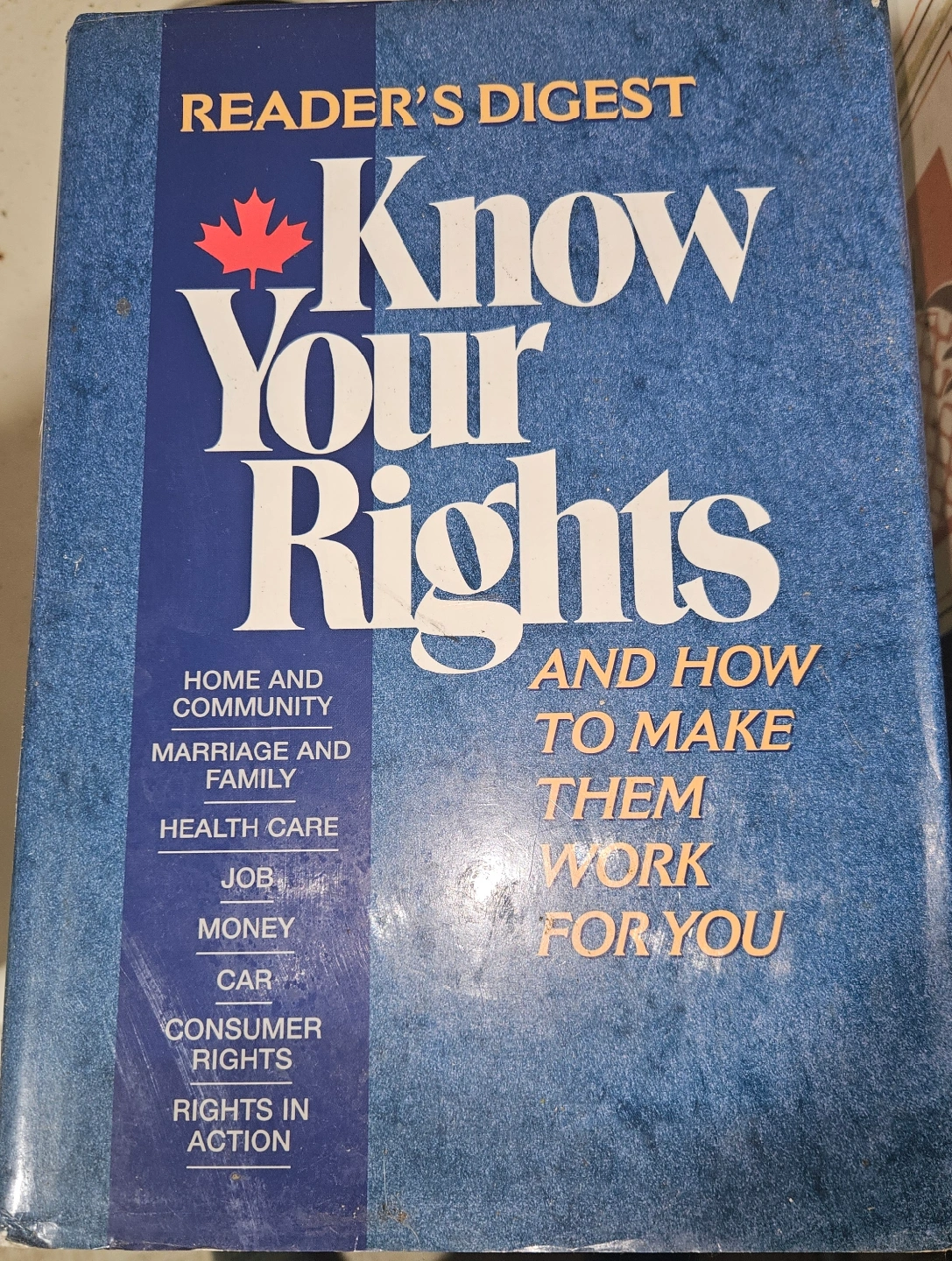 64Reader's Digest book titled 'Know Your Rights'. It covers various topics including home and community, marriage and family, health care, job, money, car, consumer rights, and rights in action