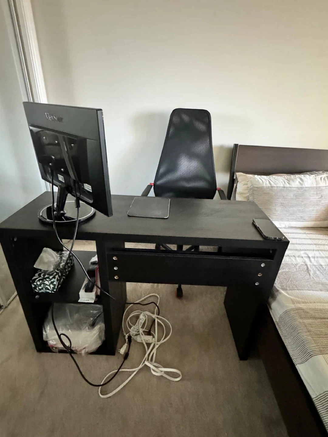 Selling a black desk and office chair set. The desk appears to be made of wood, and the chair has a mesh back for comfortable support. Great for a home and office setup!
