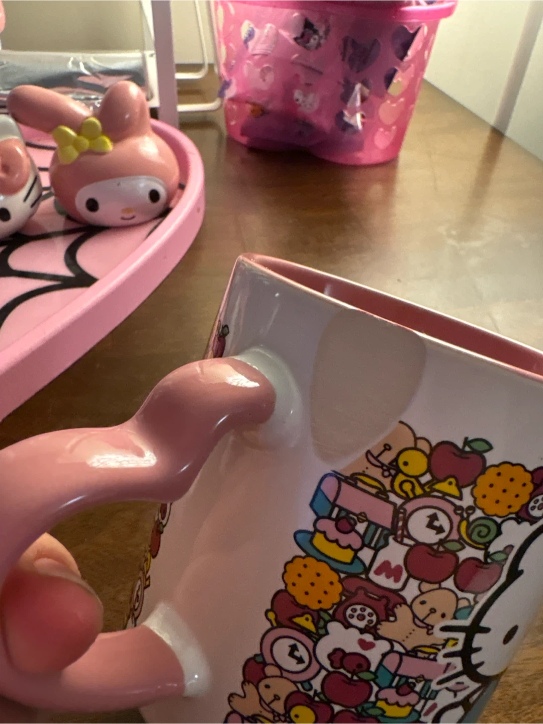 Super cute Hello Kitty mug! It features a heart-shaped handle and is covered in adorable Hello Kitty and friends designs. Perfect for any Hello Kitty fan!