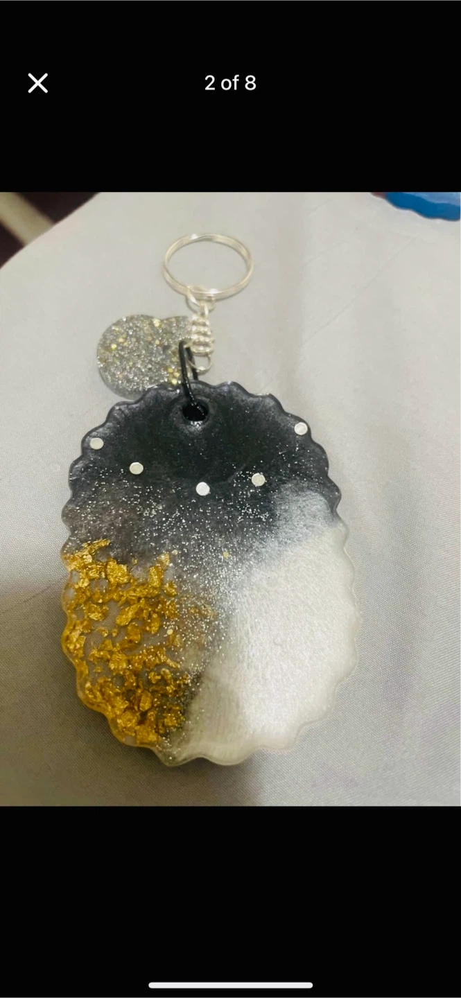 Selling a cute handmade resin keychain. It features a unique design with black, white, and gold colors and glitter accents. Perfect for adding a personal touch to your keys or bag!