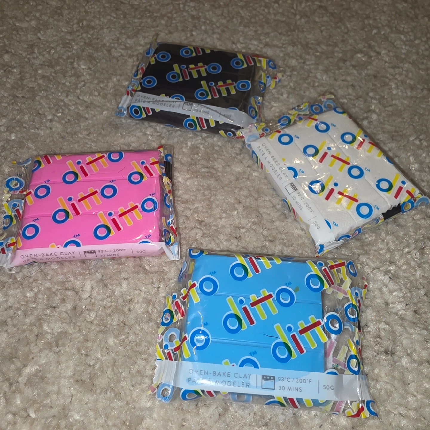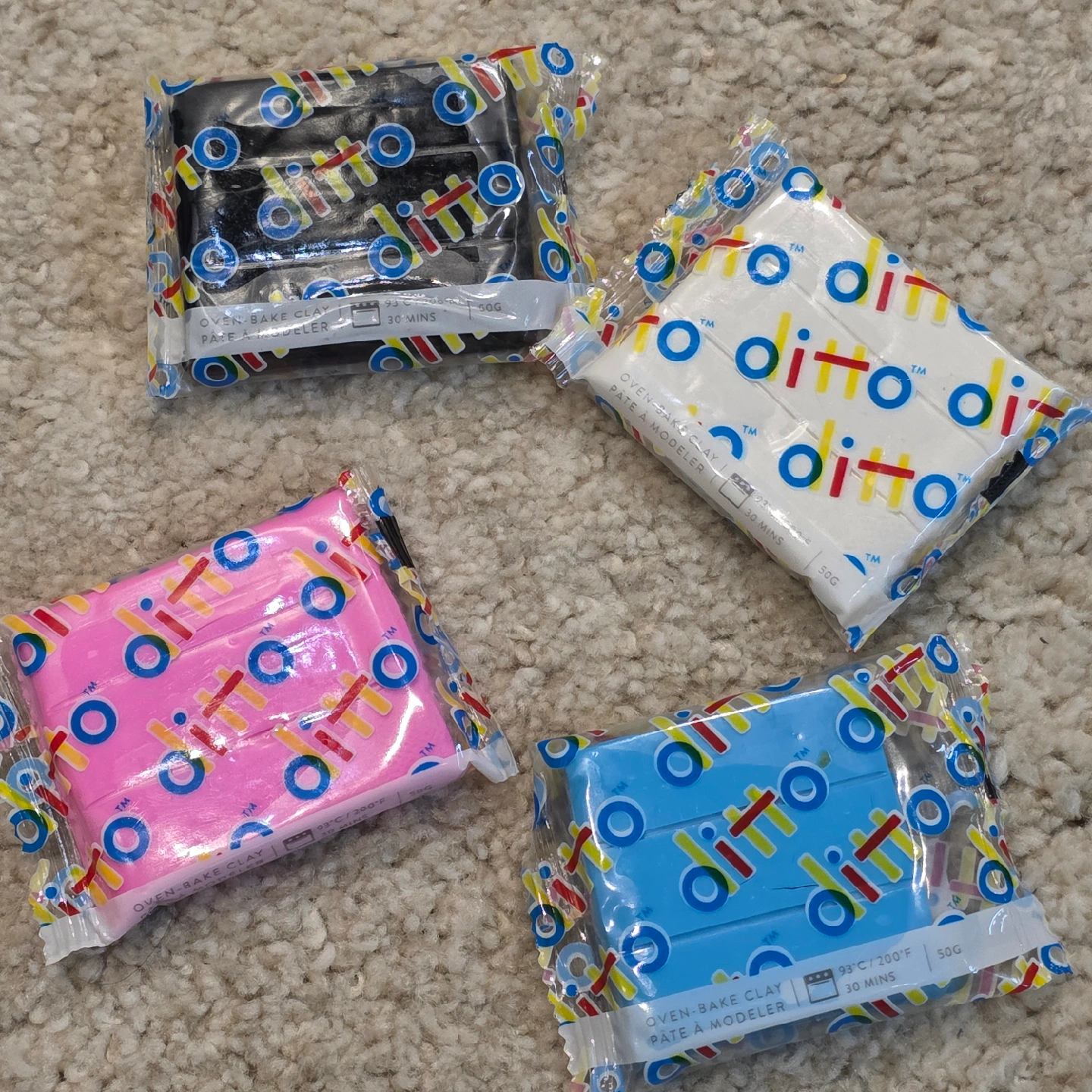 Four packs of Oitto oven-bake clay! Each pack is 50g and can be baked at 93°C / 200°F for 30 minutes. The colours included are black, white, pink, and blue. Perfect for your next crafting project!