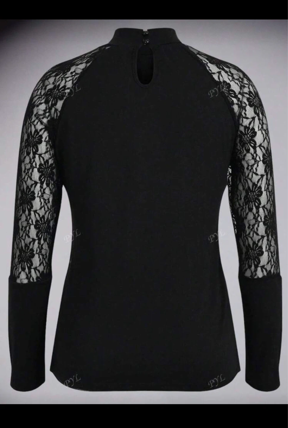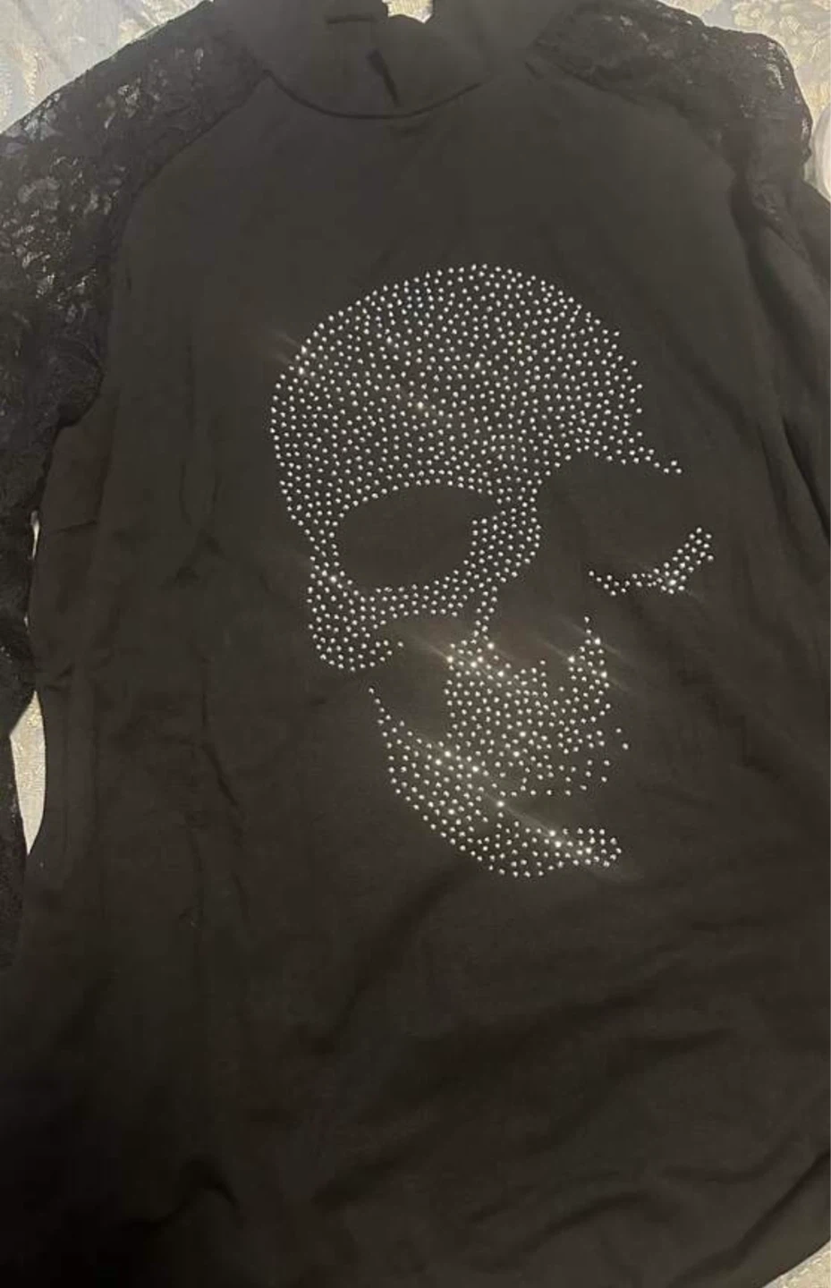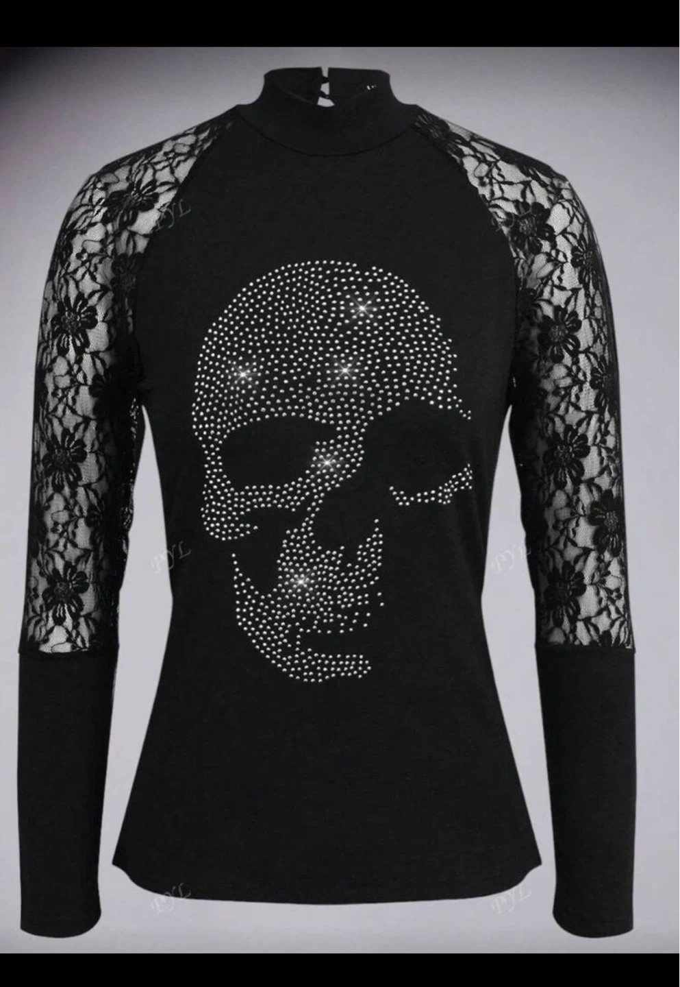 Selling a black long sleeve top with a unique skull design. It features lace sleeves and a high neckline. Perfect for adding a bit of edge to your wardrobe!