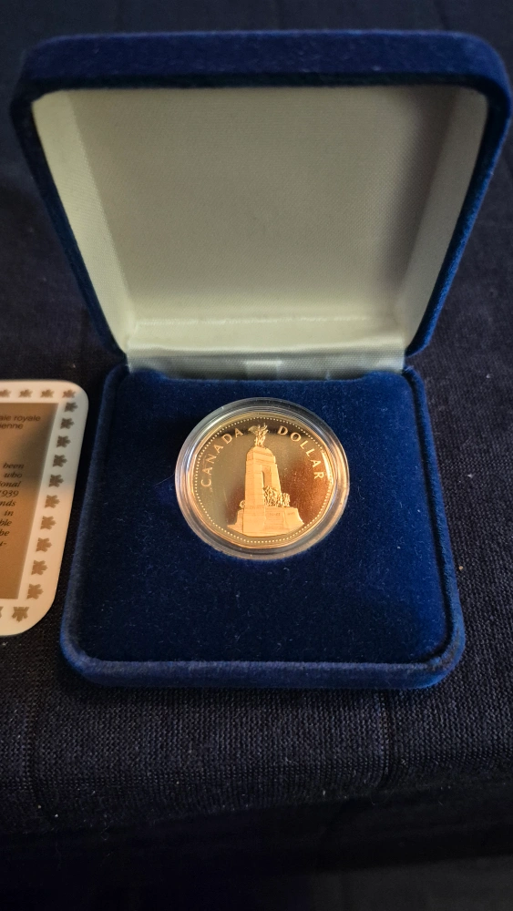 This commemorative dollar was minted to pay tribute to Canadians who answered the call to serve. It's made of Bronze Electroplated on Nickel with a diameter of 26.50 mm and a weight of 7 g. This coin commemorates the National War Memorial, officially unveiled in 1939.