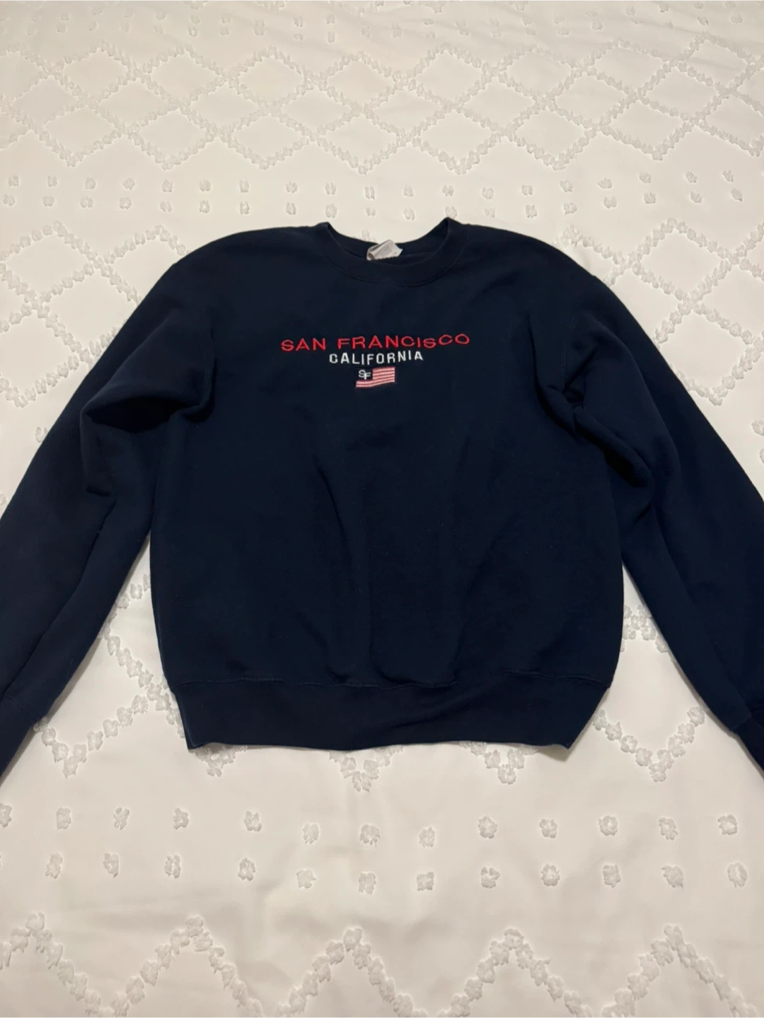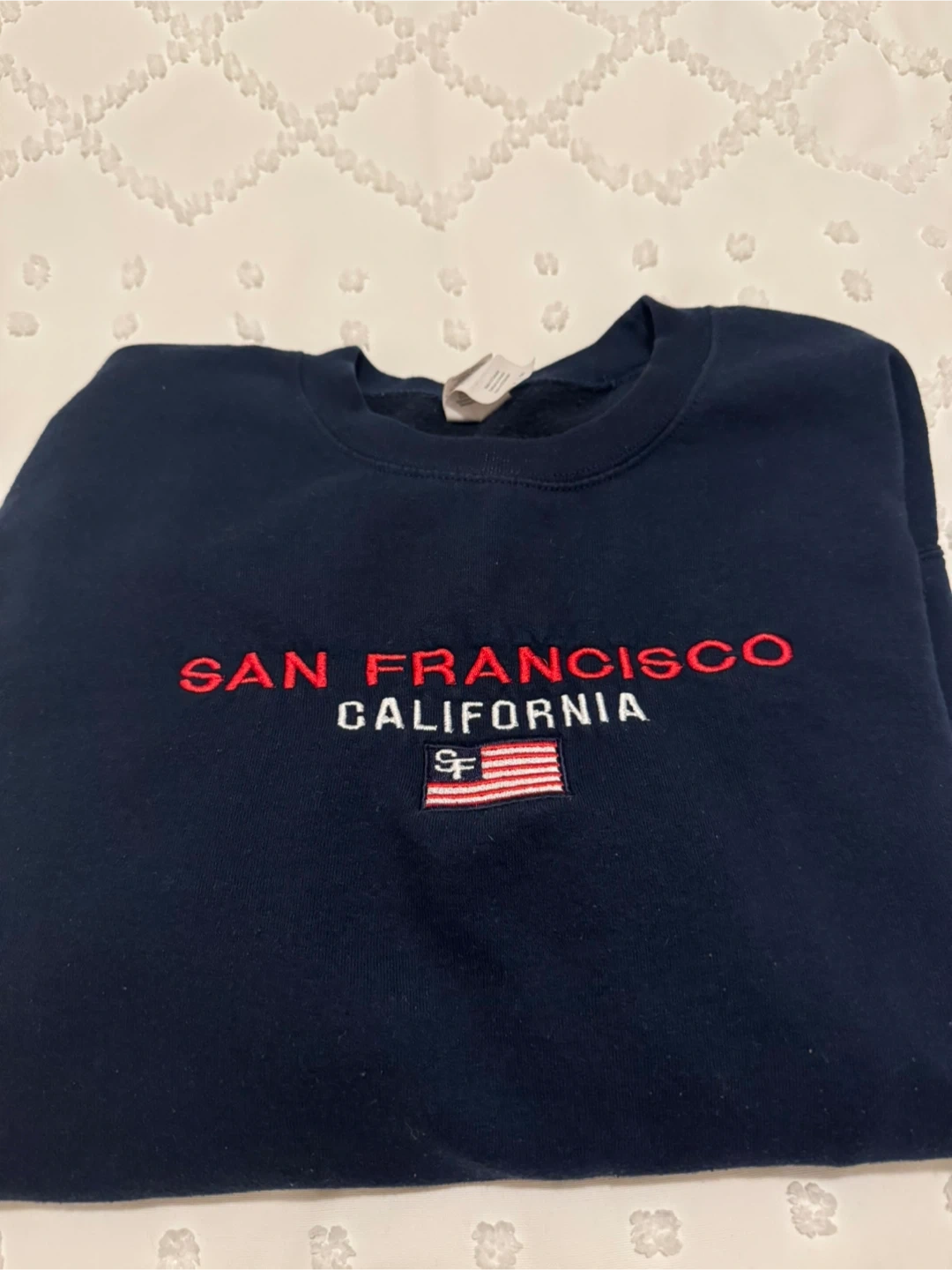 Here's a comfy sweatshirt featuring 'San Francisco California' embroidered on the front with an American flag design It's a navy blue colour and would be great for casual wear