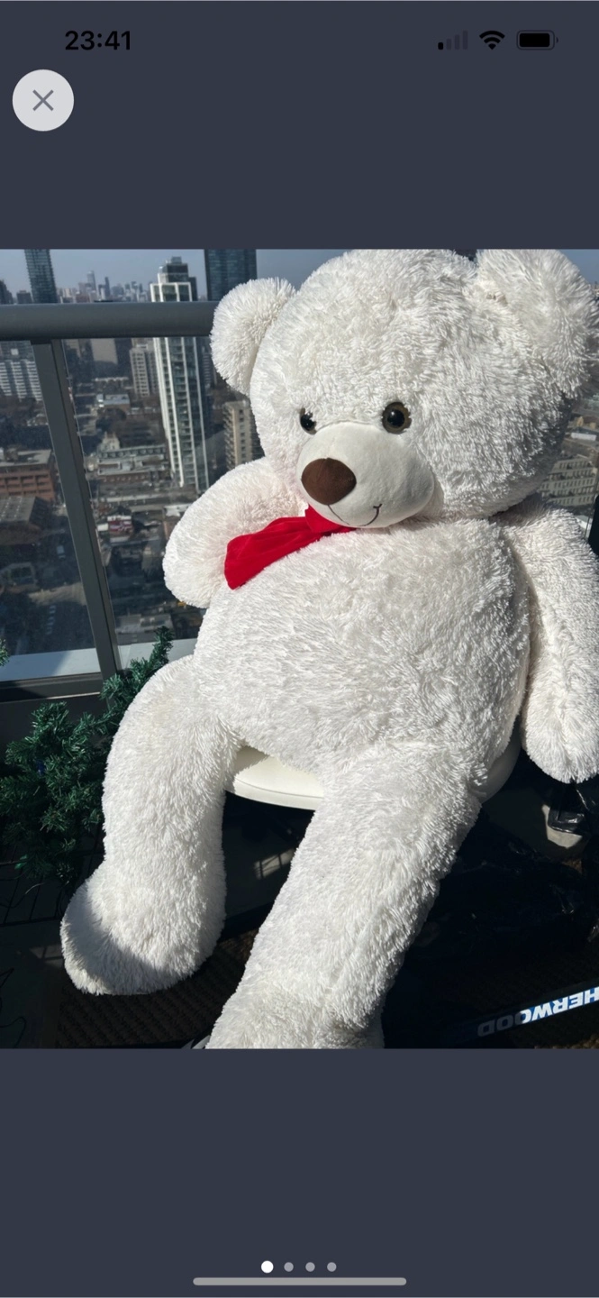 Selling a super cuddly giant white teddy bear! It has a cute red bow around its neck. Perfect for a gift or to add some fun to any room!