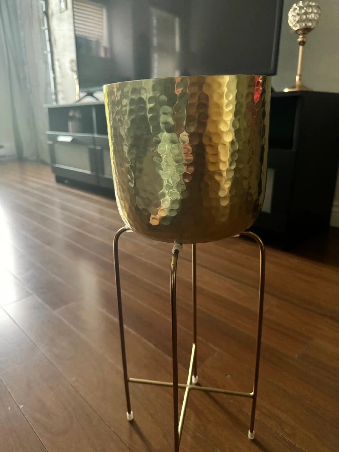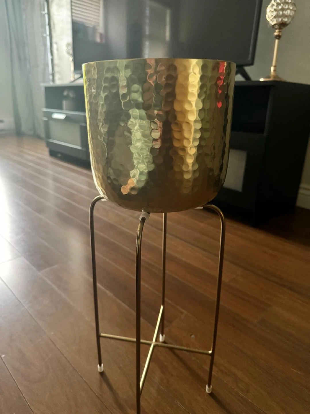 Selling a lovely gold metal plant pot with a matching stand. It's in great condition and ready to add a touch of elegance to your home. Perfect for displaying your favourite plants!