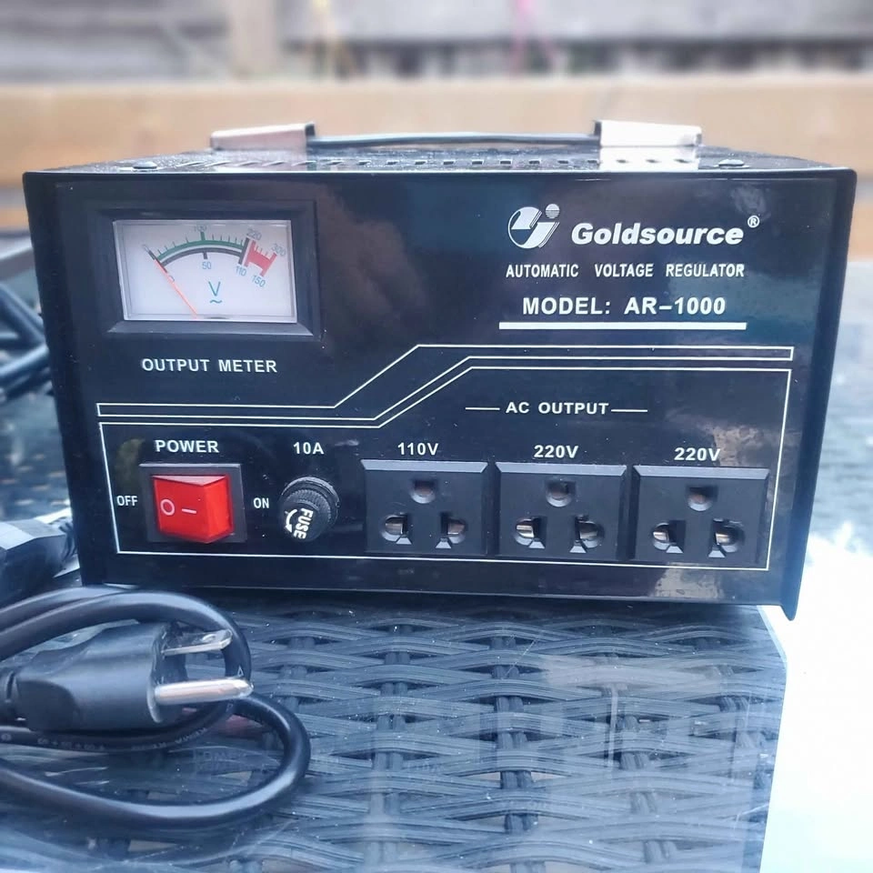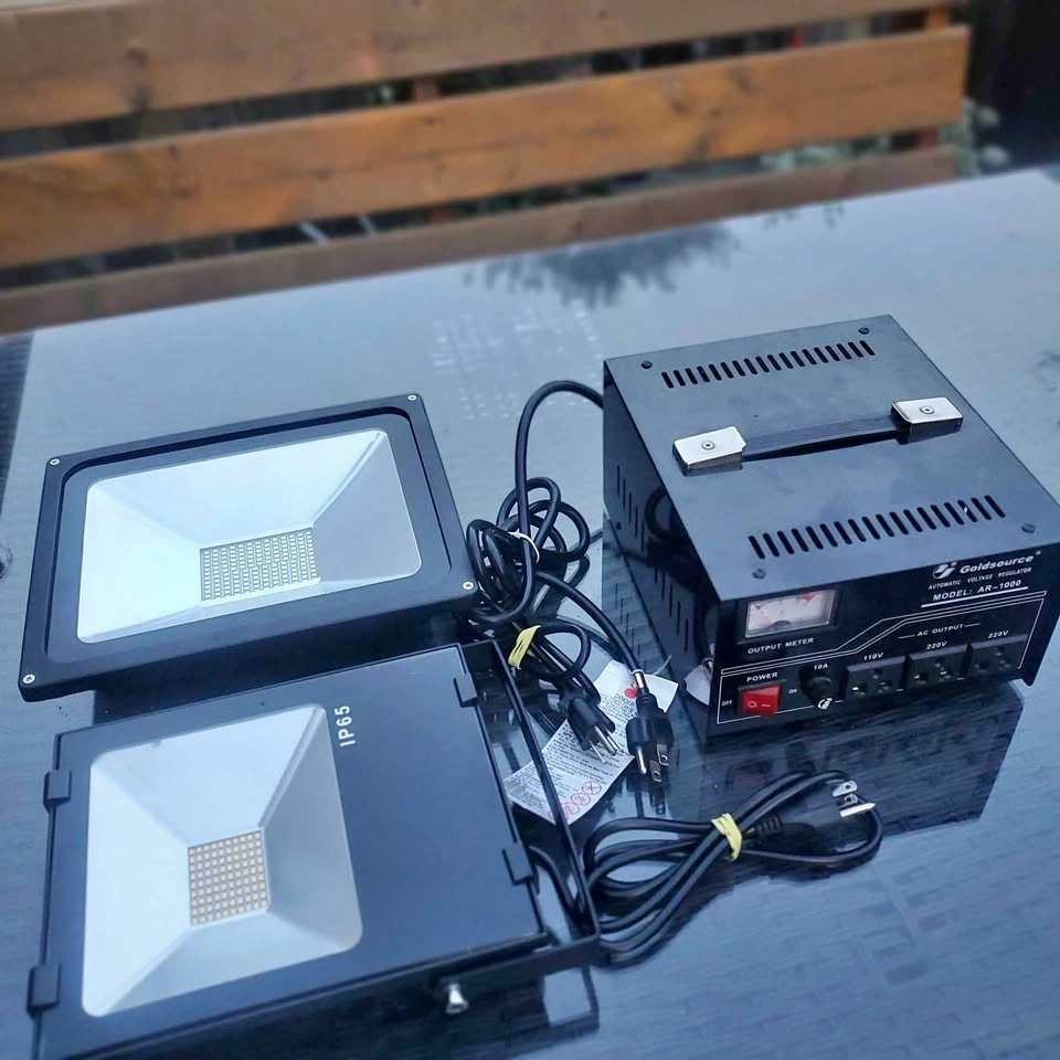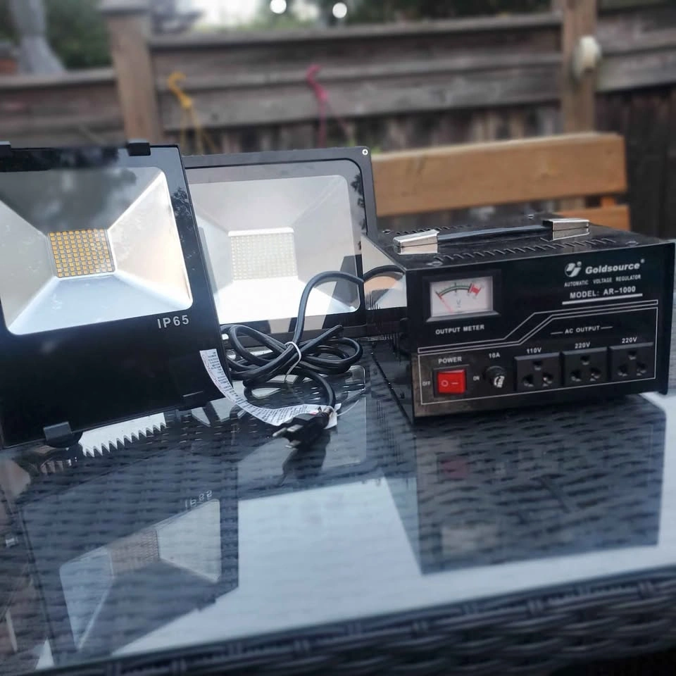 Goldsource Heavy duty AR-1000 automatic voltage regulator step up/down transformer, perfect for converting electricity so you can rely on it for your voltage conversion needs. Also included are two 50W LED Project Lamps. Here are some details about the voltage regulator: * Model: AR-1000 * Automatic Voltage Regulator * AC Output: 110V and 220V * Includes 2 new LED Work lights