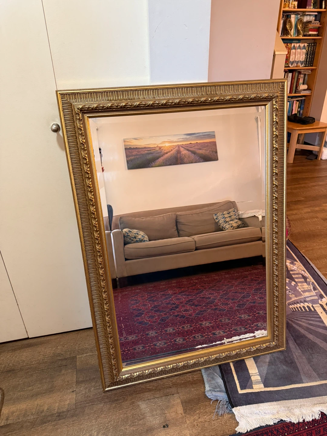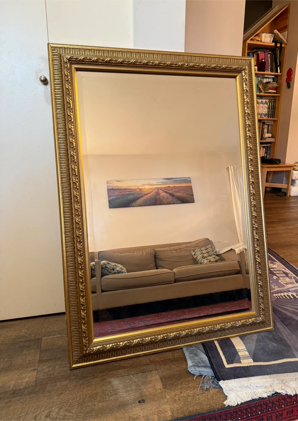 Selling a large gold framed wall mirror. It's in great condition. The frame has a beautiful ornate design that adds a touch of elegance.