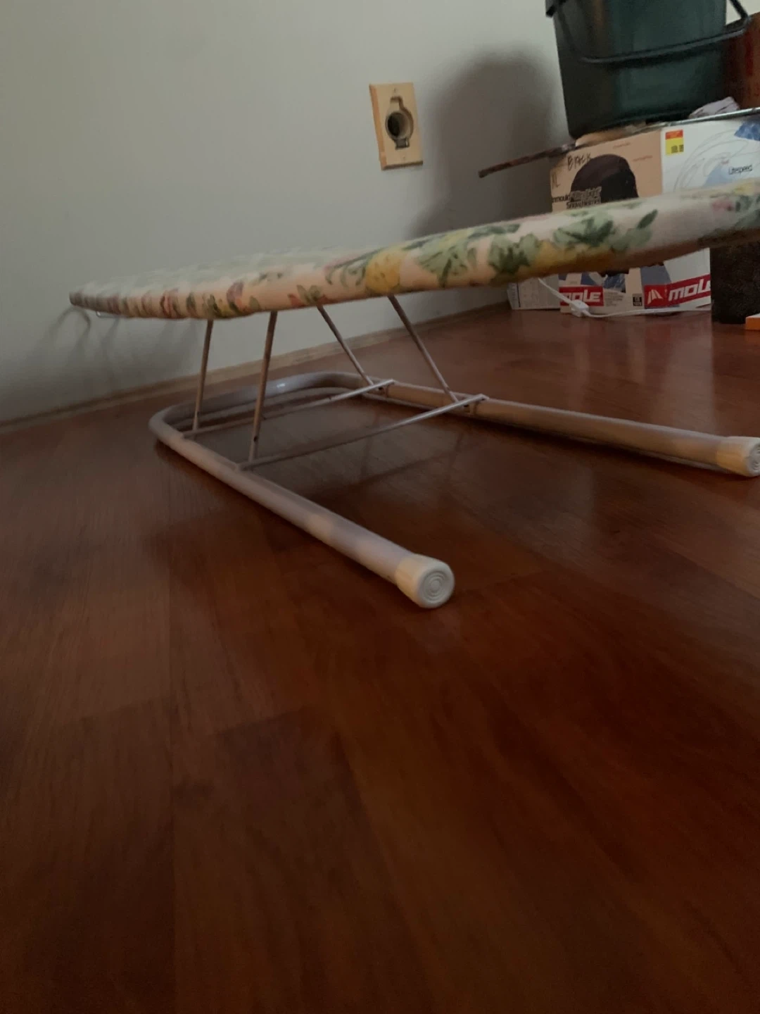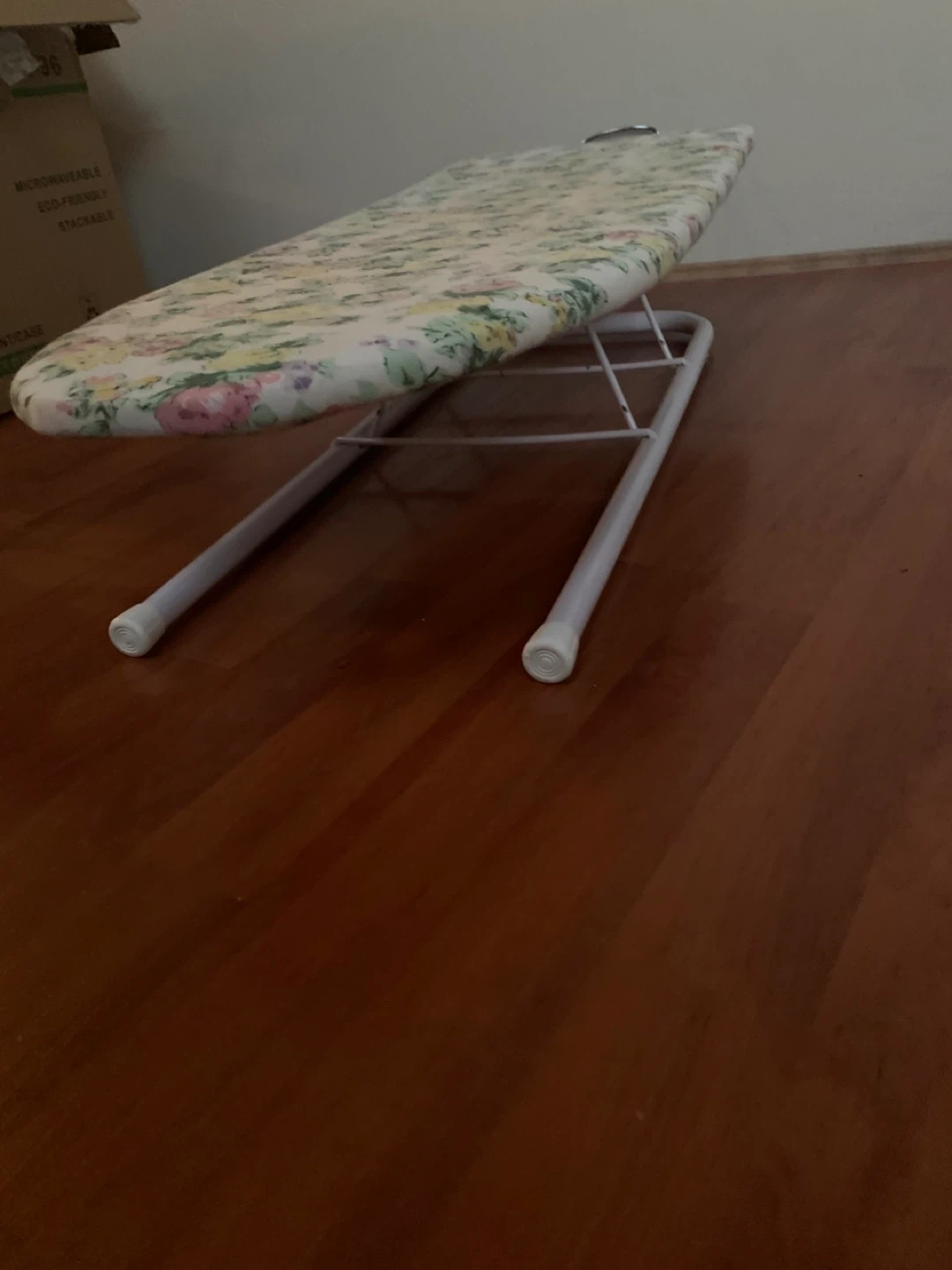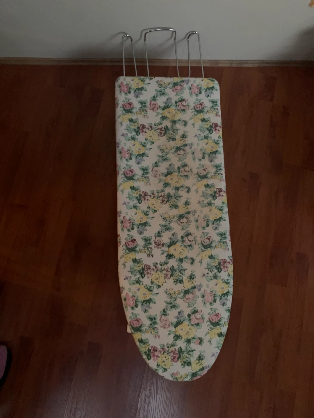 Selling an ironing board with a floral patterned cover. It's in good condition and ready for a new home. Perfect for getting your clothes wrinkle-free!