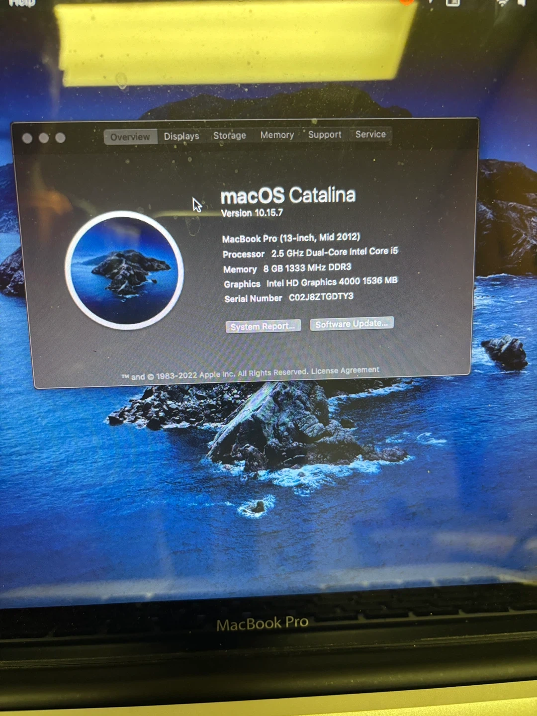 Selling an Apple MacBook Pro (13-inch, Mid 2012, A1278) reformatted to run macOS Catalina. It has a 2.5 GHz Dual-Core Intel Core i5 processor, 8 GB 1333 MHz DDR3 memory, 512GB SSD Hard Drive and Intel HD Graphics 4000 1536 MB graphics. The battery holds a charge but you will want to replace it. Please note this does not come with a charger.