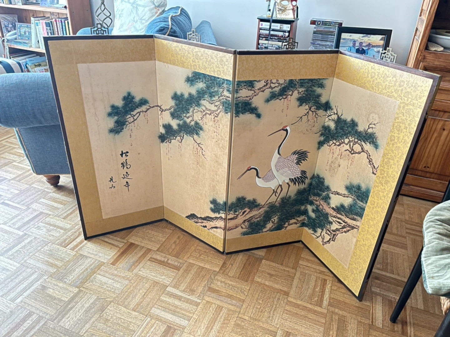 Selling a vintage Asian folding screen. It's a beautiful fireplace screen with a traditional design featuring cranes and pine trees. It's in great condition and would make a lovely addition to any home with or without the traditional fireplace.