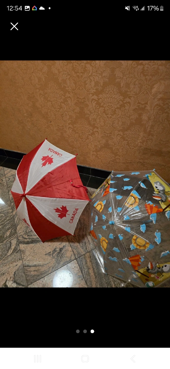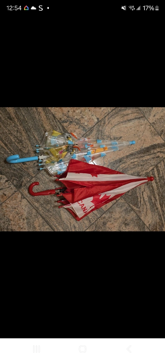 Two adorable umbrellas for kids! One features the Canadian flag, and the other has a cute cartoon design. Perfect for keeping your little ones dry on rainy days! Steeles and yonge
