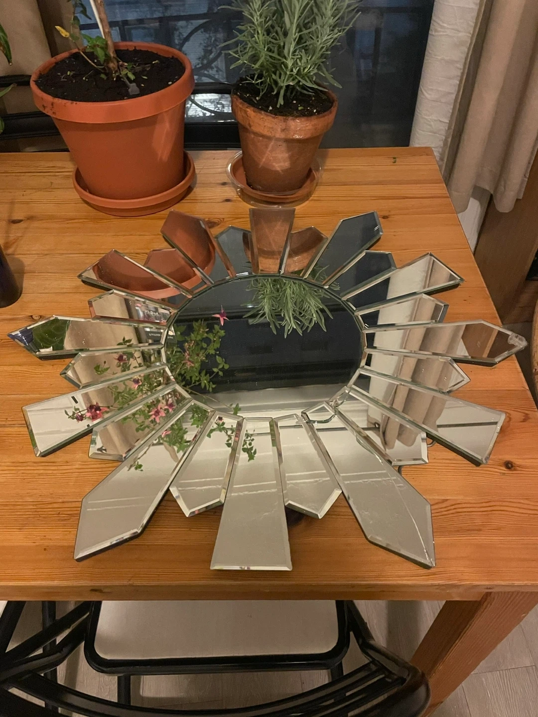 Selling a cute sunburst mirror! It would be perfect for adding a bit of flair to any room. There is a small crack across a small portion of the mirror, as shown in the last photo.