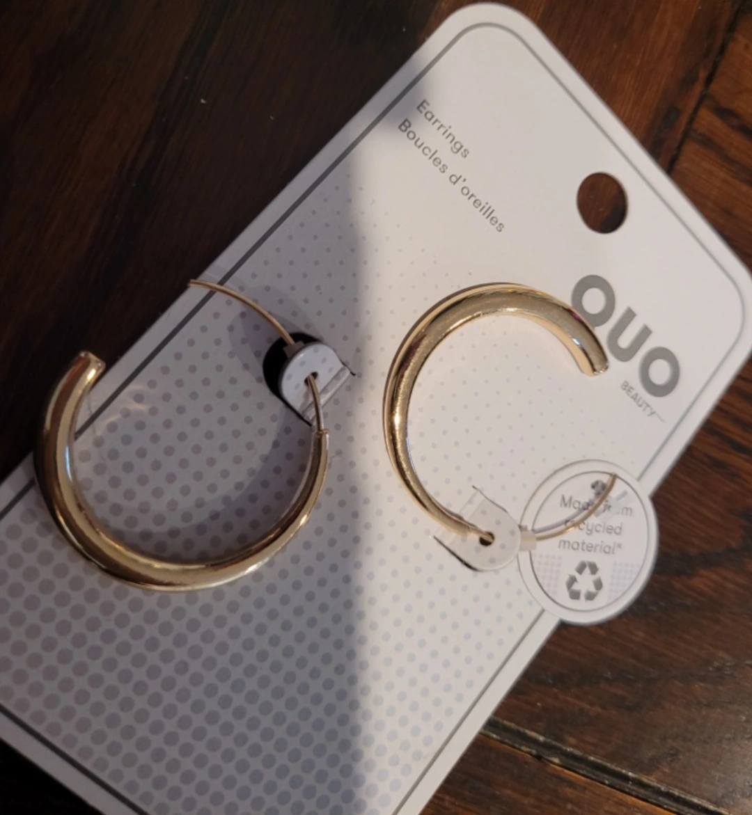 These are a pair of gold hoop earrings from OUO Beauty. They are made from recycled material, so you can feel good about your purchase. These earrings would make a great addition to any outfit!