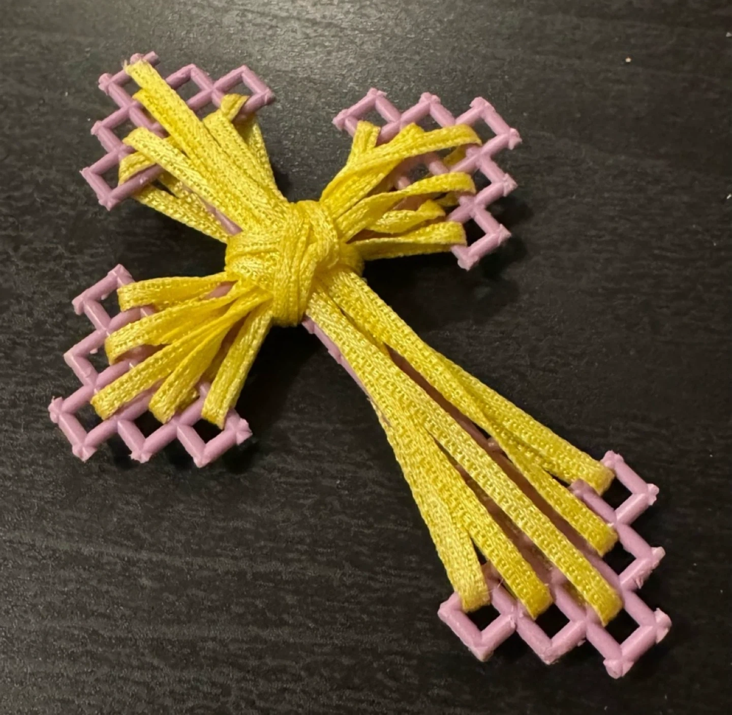 This is a handmade cross decoration. It's a unique piece with a yellow woven design on a light purple plastic base. Perfect to use as a bookmark, keychain, bag charm or tree ornament.