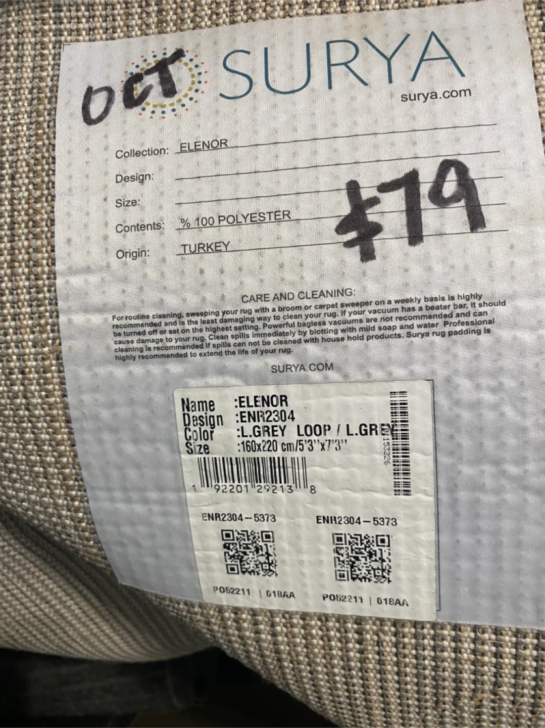 This is a Surya Elenor rug in a lovely grey loop colour. It's made of 100% polyester and measures 160cm x 220cm, or 5'3" x 7'3".