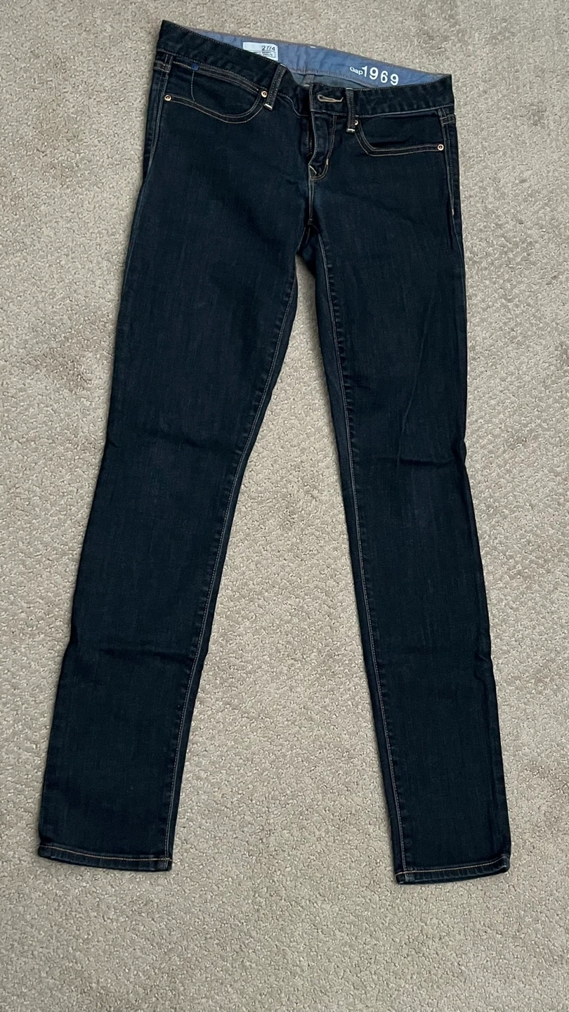 39Selling a pair of Gap 1969 Always Skinny jeans in size 27/4. They are a dark wash denim and in great condition! The material is comfortable and perfect for everyday wear.
