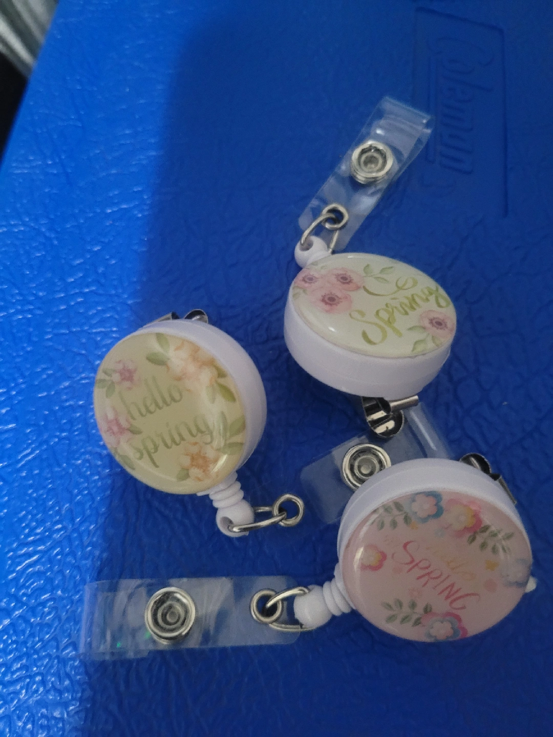 A set of three cute badge reels with a "Hello Spring" floral design! These are perfect for adding a touch of spring to your work or school attire. They are in great condition and ready to use