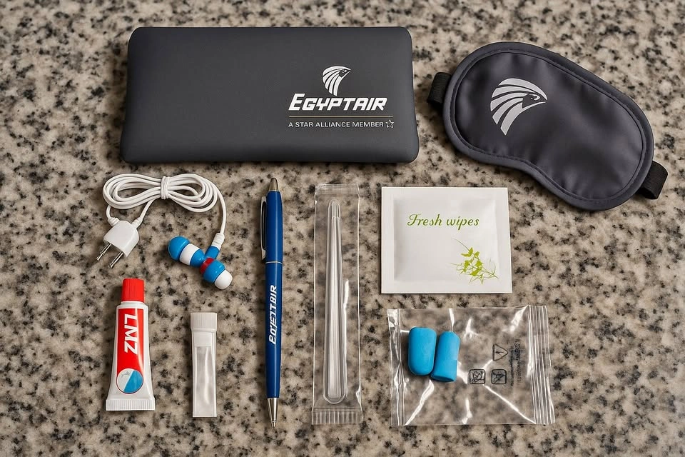 Flying vibes without leaving the ground! This authentic EgyptAir amenity pouch comes complete with all the travel essentials you’d normally only get onboard. Perfect for collectors, aviation fans, or anyone who wants a handy little travel set. ====================== BUY 3+ ITEMS, GET 50% OFF! ======================== Includes: EgyptAir branded pouch Earphones w/ airplane adapter Eye mask EgyptAir pen ✍️ Mini toothpaste + case Comb Fresh wipes Foam earplugs 🛫 Condition: Brand new, never used.